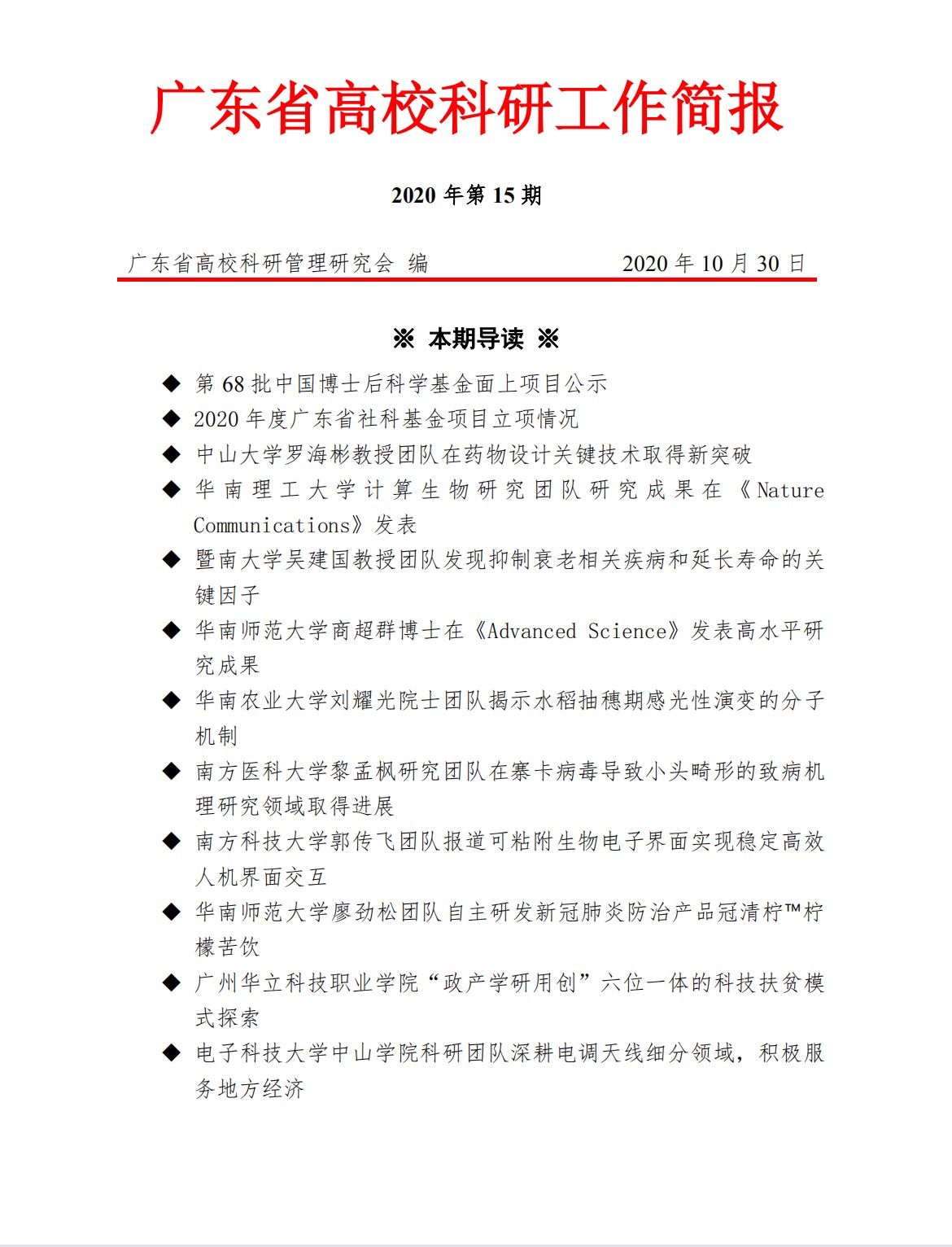 2020年10月30日,《廣東省高??蒲泄ぷ骱唸?bào)》(2020年第15期)《“政產(chǎn)學(xué)研用創(chuàng)”六位一體的科技扶貧模式探索》重點(diǎn)報(bào)道了我?!班l(xiāng)村振興”和“脫貧攻堅(jiān)”工作。