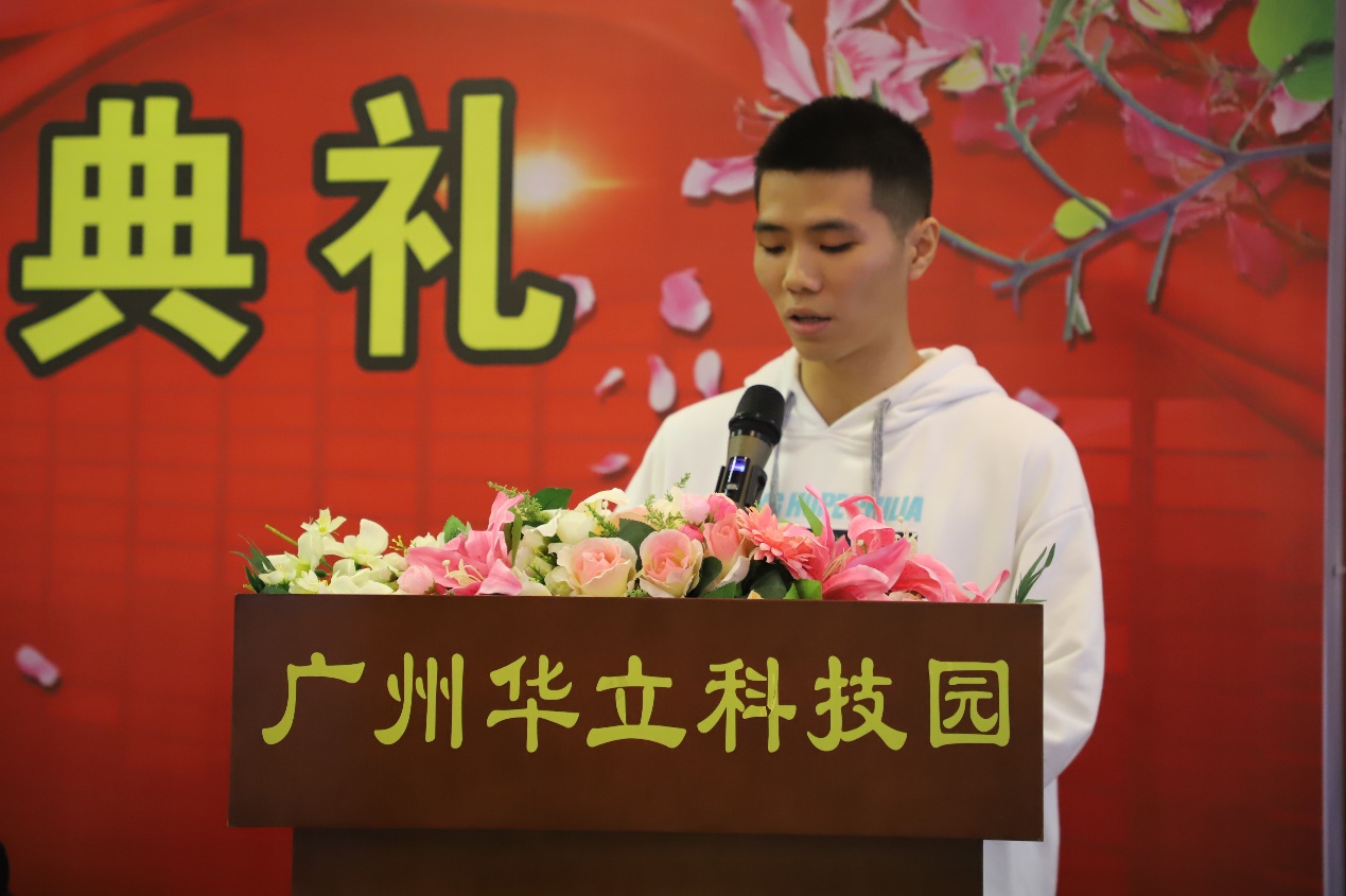 新生代表謝栩東代表全體新生發(fā)言。他感謝黨和國(guó)家給的這次機(jī)會(huì),并表示將會(huì)努力完成學(xué)業(yè)、積極獲得學(xué)歷的決心和愿望。