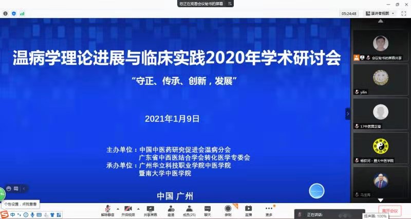 2021年1月9日由中國中醫(yī)藥研究促進會溫病分會、廣東省中西醫(yī)結(jié)合學(xué)會轉(zhuǎn)化醫(yī)學(xué)專業(yè)委員會主辦,廣州華立科技職業(yè)學(xué)院中醫(yī)藥學(xué)院、暨南大學(xué)中醫(yī)學(xué)院共同承辦的以“傳承、守正、創(chuàng)新、發(fā)展”為主題的全國溫病學(xué)理論進展與臨床實踐學(xué)術(shù)交流大會以騰訊會議的形式在線圓滿舉行。開幕式由我校中醫(yī)藥學(xué)院院長楊欽河教授主持。