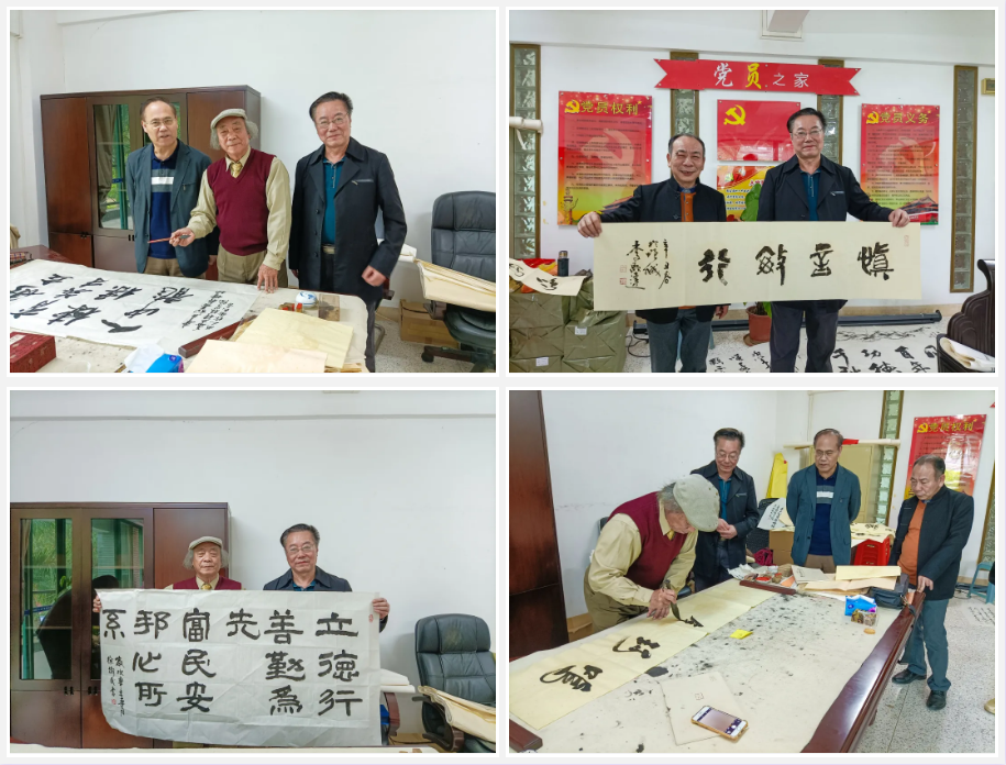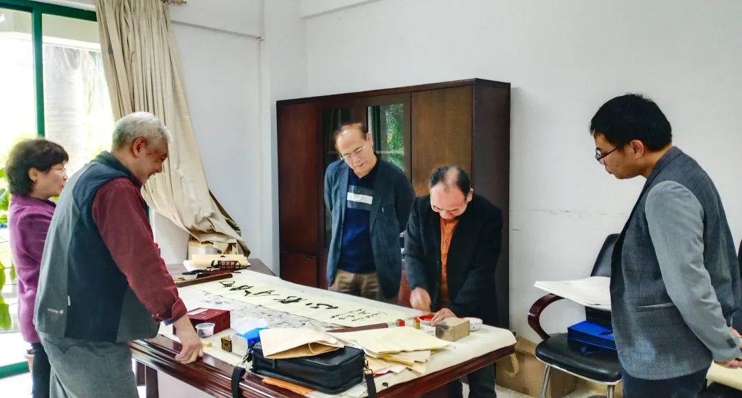 隨后,陳明副主席一行到行政樓與學(xué)校領(lǐng)導(dǎo)進(jìn)行座談交流和工作研討。校黨委書(shū)記林偉健教授介紹學(xué)校的黨建工作和文化建設(shè)、專(zhuān)業(yè)建設(shè)等情況,并就慶祝建黨一百周年、黨史學(xué)習(xí)教育等方面的工作和大家作了深入探討,提出了工作思路和合作內(nèi)容。下午,藝術(shù)家們?cè)趯W(xué)校舉行筆會(huì),現(xiàn)場(chǎng)揮毫,創(chuàng)作了“風(fēng)濤百年,功德千秋”“心有所信,方能遠(yuǎn)行”“十萬(wàn)和諧”“欣欣向榮”等多件書(shū)法作品和國(guó)畫(huà)作品,其精湛高超的藝術(shù)造詣得到大家的高度贊賞。