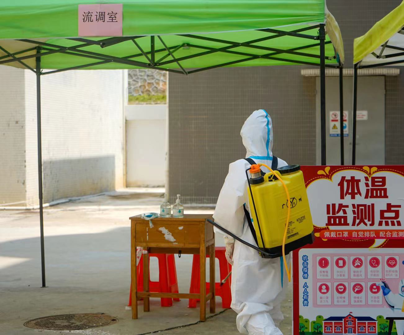 場(chǎng)景六:重點(diǎn)人員轉(zhuǎn)運(yùn)和場(chǎng)所消殺。將重點(diǎn)人員轉(zhuǎn)運(yùn)至集中隔離點(diǎn),消毒人員對(duì)張某的宿舍、課室等場(chǎng)所進(jìn)行消毒。