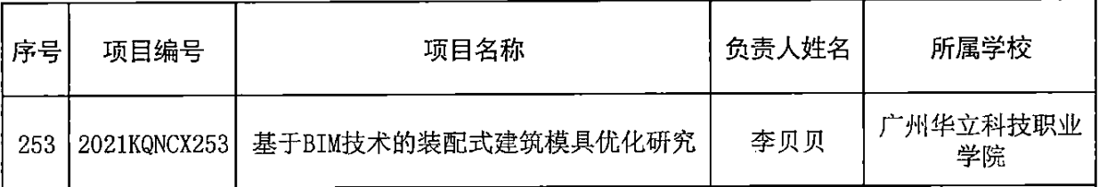 根據(jù)《廣東省教育廳關(guān)于開展2021年度廣東高校科研平臺(tái)和科研項(xiàng)目申報(bào)工作的通知》,經(jīng)學(xué)校推薦、省教育廳組織專家評(píng)審,我校馬俊副校長(zhǎng)《基于立德樹人的高?!叭恕迸囵B(yǎng)路徑研究》等3項(xiàng)課題獲特色創(chuàng)新類立項(xiàng),李貝貝《基于BIM技術(shù)的裝配式建筑模具優(yōu)化研究》等3項(xiàng)課題獲青年創(chuàng)新類立項(xiàng),希望課題負(fù)責(zé)人能夠按照教育廳要求,認(rèn)真完成課題相關(guān)要求。