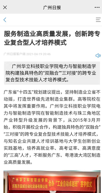幾年來,學校高度重視推進《深化新時代教育評價改革總體方案》,堅持立德樹人,牢記為黨育人、為國育才使命,充分發(fā)揮教育評價的指揮棒作用,引導確立科學的育人目標。不以成績論英雄,“以華立不是你的終點,而是你的人生起點”為口號來激勵學生,同時在德技并修、產(chǎn)教融合、校企合作、育訓結(jié)合過程中落實立德樹人根本任務,將習近平新時代中國特色社會主義思想貫穿技術(shù)技能人才培養(yǎng)全過程。學習強國、廣州日報、新華網(wǎng)、廣東科技報等重量級媒體平臺多次重點報道和推廣我校的科-產(chǎn)-教融合育人工作經(jīng)驗。