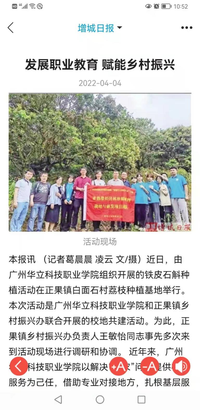 鄉(xiāng)村振興,教育有為。華立職院高度重視增強(qiáng)教育服務(wù)地方發(fā)展的能力,以高校服務(wù)農(nóng)村產(chǎn)業(yè)革命項(xiàng)目為載體,將職業(yè)教育主動(dòng)融入鄉(xiāng)村教育規(guī)劃發(fā)展,大力培養(yǎng)高素質(zhì)農(nóng)民。推動(dòng)“鄉(xiāng)村振興人才培養(yǎng)計(jì)劃”,努力開展“紅色筑夢(mèng)之旅”,在鄉(xiāng)村振興中做有溫度有良心的職業(yè)教育。2022年3月26日,教務(wù)處組織財(cái)經(jīng)學(xué)院團(tuán)隊(duì)來到增城區(qū)著名的愛國(guó)主義教育基地-白面石村開展了職業(yè)教育進(jìn)鄉(xiāng)村的各項(xiàng)實(shí)踐活動(dòng)。財(cái)經(jīng)學(xué)院團(tuán)隊(duì)在劉惠玲院長(zhǎng)的帶領(lǐng)下,結(jié)合李向林教授的石斛種植項(xiàng)目,把愛家鄉(xiāng)教育作為課程思政和德育工作的重要方向,開展“記得住鄉(xiāng)愁”和“愛家鄉(xiāng)愛祖國(guó)”教育活動(dòng),開展勞動(dòng)實(shí)踐教育活動(dòng),同時(shí)為我校的勞動(dòng)教育實(shí)踐基地落戶白面石村打開了新局面。
