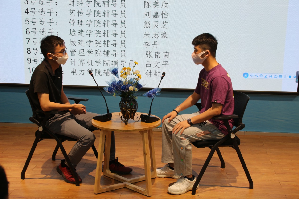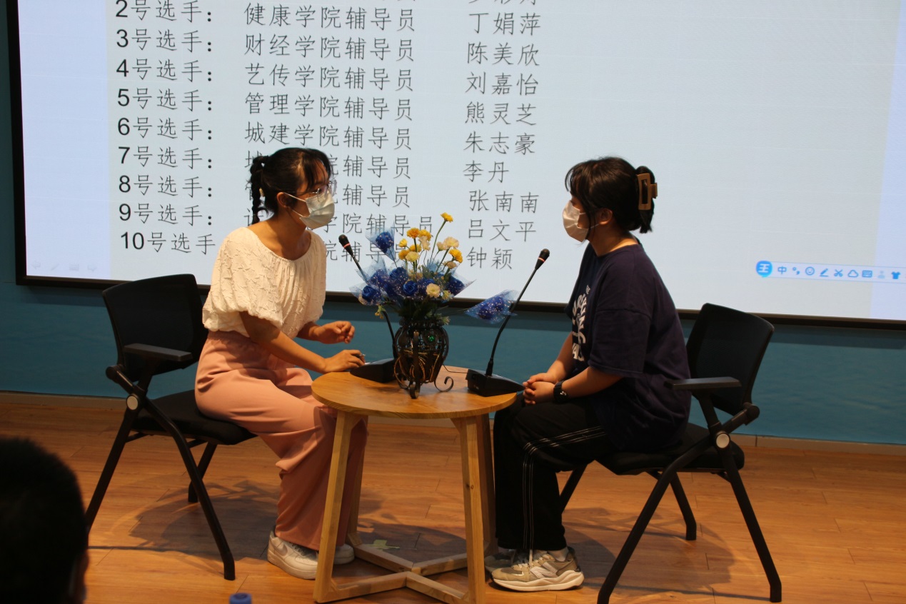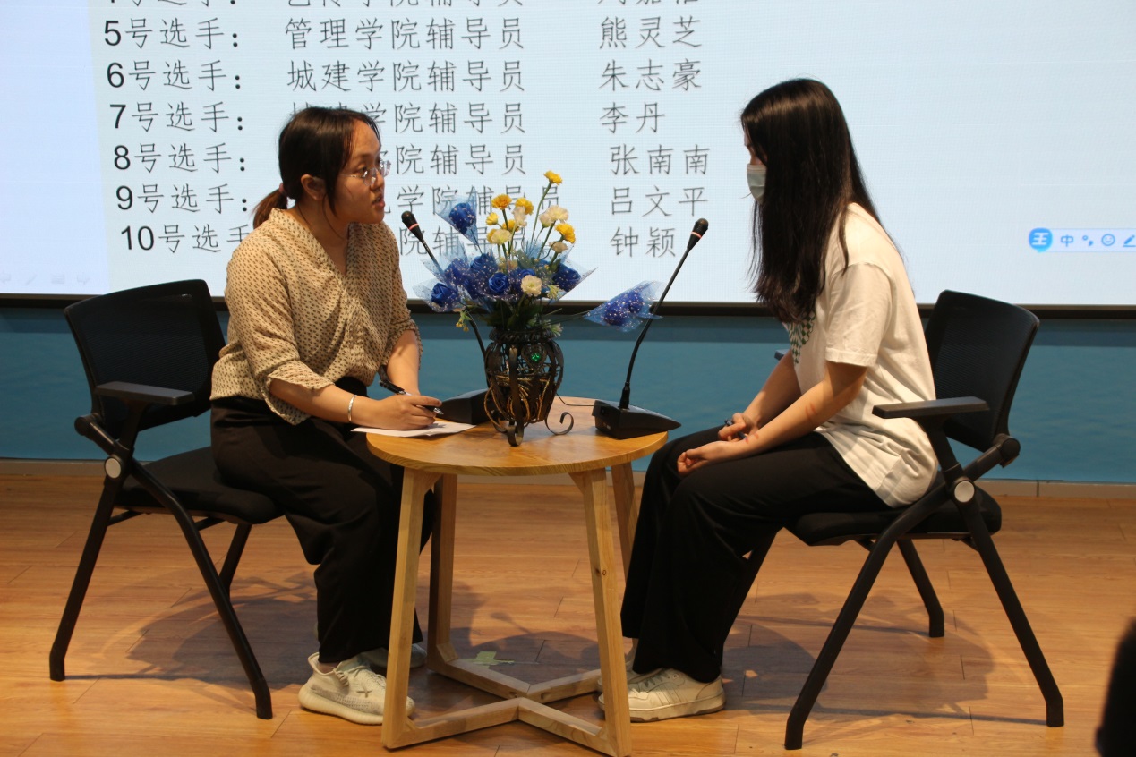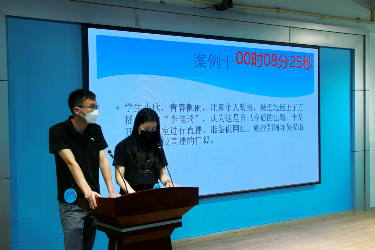 比賽分為案例研討和談心談話兩個項(xiàng)目,再現(xiàn)了當(dāng)下大學(xué)生思想政治教育和日常教育管理中的熱點(diǎn)難點(diǎn)問題,如疫情防控、價值取向、學(xué)業(yè)、就業(yè)、情感、人際關(guān)系、心理健康、學(xué)生干部培養(yǎng)等問題。案例研討以兩兩抽簽成組,“我提問,你回答”的方式開展。選手圍繞案例共同辨析原因、研討對策、總結(jié)規(guī)律。談心談話以情景再現(xiàn)的方式,參賽輔導(dǎo)員充分運(yùn)用思想政治教育及相關(guān)學(xué)科原理、方法、策略,為“學(xué)生”答疑解惑、指明方向。參賽選手思路清晰、導(dǎo)向正確,充分展示了我校輔導(dǎo)員積極向上的精神面貌和較高的職業(yè)素養(yǎng)。
