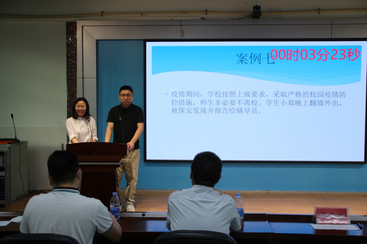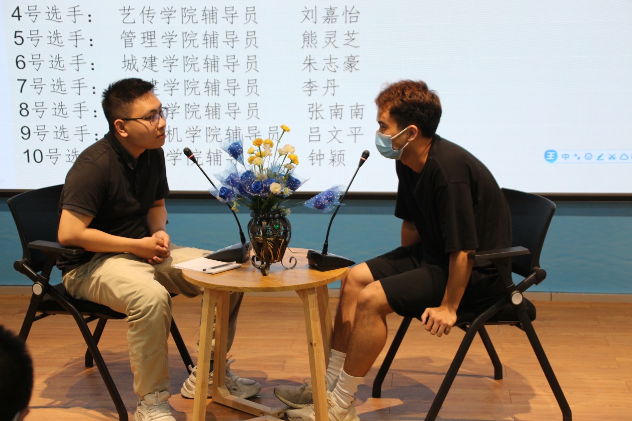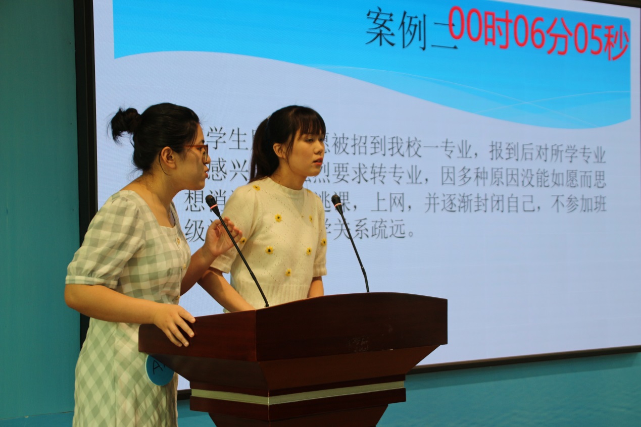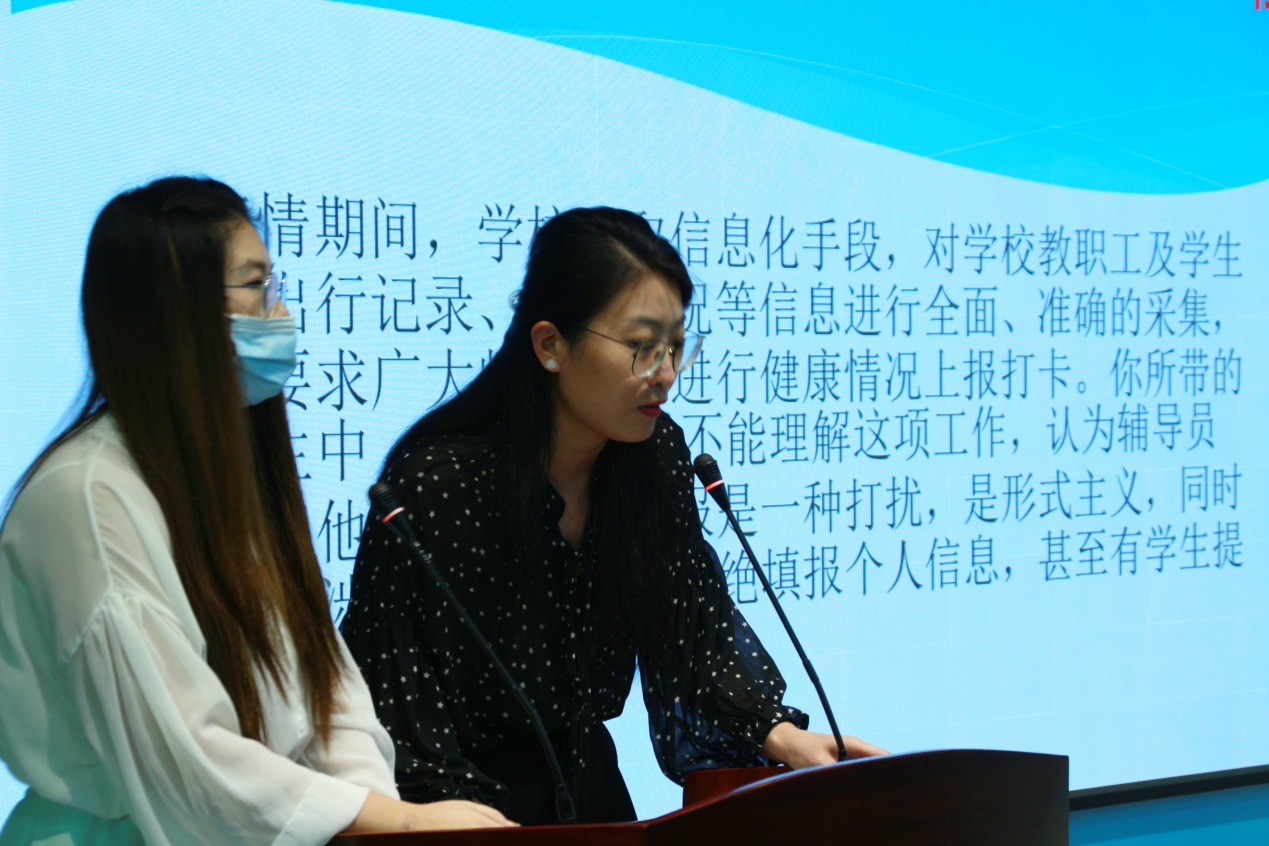 比賽分為案例研討和談心談話兩個項(xiàng)目,再現(xiàn)了當(dāng)下大學(xué)生思想政治教育和日常教育管理中的熱點(diǎn)難點(diǎn)問題,如疫情防控、價值取向、學(xué)業(yè)、就業(yè)、情感、人際關(guān)系、心理健康、學(xué)生干部培養(yǎng)等問題。案例研討以兩兩抽簽成組,“我提問,你回答”的方式開展。選手圍繞案例共同辨析原因、研討對策、總結(jié)規(guī)律。談心談話以情景再現(xiàn)的方式,參賽輔導(dǎo)員充分運(yùn)用思想政治教育及相關(guān)學(xué)科原理、方法、策略,為“學(xué)生”答疑解惑、指明方向。參賽選手思路清晰、導(dǎo)向正確,充分展示了我校輔導(dǎo)員積極向上的精神面貌和較高的職業(yè)素養(yǎng)。