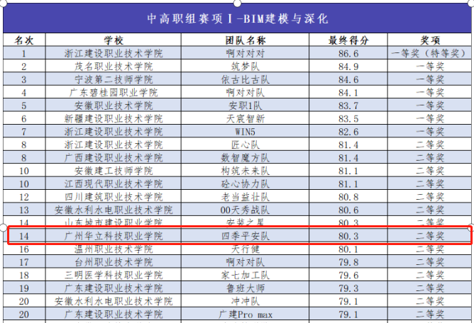 由城建學院工程造價專業(yè)陳嘉偉、陸土泉、傅劍亮和建設(shè)工程監(jiān)理專業(yè)的甘林峰同學組成的“四季平安隊”,在城建學院李貝貝、歐雪琴老師的精心指導下,獲得了本次大賽總決賽高職組“BIM 建模與深化設(shè)計”賽項“二等獎”,同時,我校獲評本次比賽優(yōu)秀組織獎。