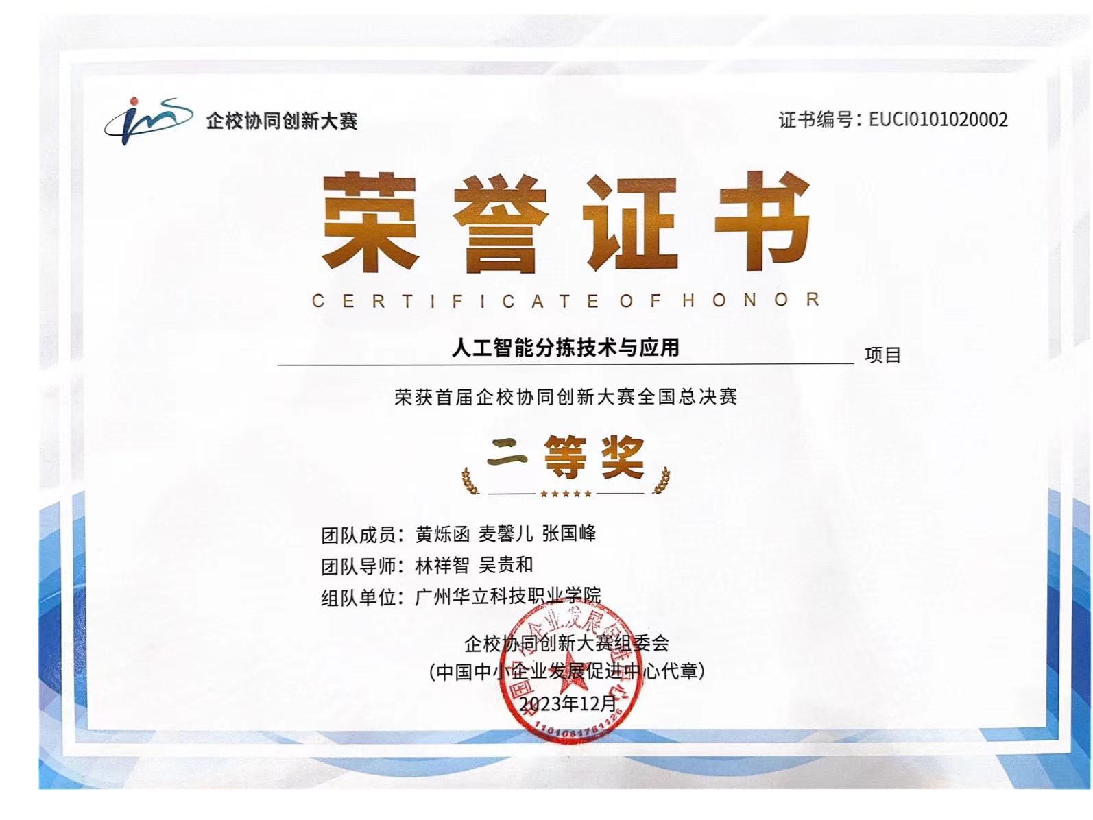 本次大賽自今年7月份啟動以來,共吸引了來自劍橋大學、哈爾濱工業(yè)大學、復旦大學、華北電力大學、北京航空航天大學、蘇州大學、電子科技大學、廈門大學等國內(nèi)外近400所院校、1700余支隊伍、超過7000人參賽。我校的參賽隊由電力與智能制造學院的林祥智老師與廣州銀變電力設備有限公司吳貴和副總經(jīng)理指導,電力與智能制造學院的黃爍函和計算機信息工程學院的麥馨兒、張國峰三位同學組成,經(jīng)過賽前的刻苦訓練和賽中的頑強拼搏,最終獲得首屆全國企校協(xié)同創(chuàng)新大賽總決賽“二等獎”的榮譽,林祥智老師獲得“優(yōu)秀指導教師”稱號,我校獲得“優(yōu)秀組織單位”稱號。