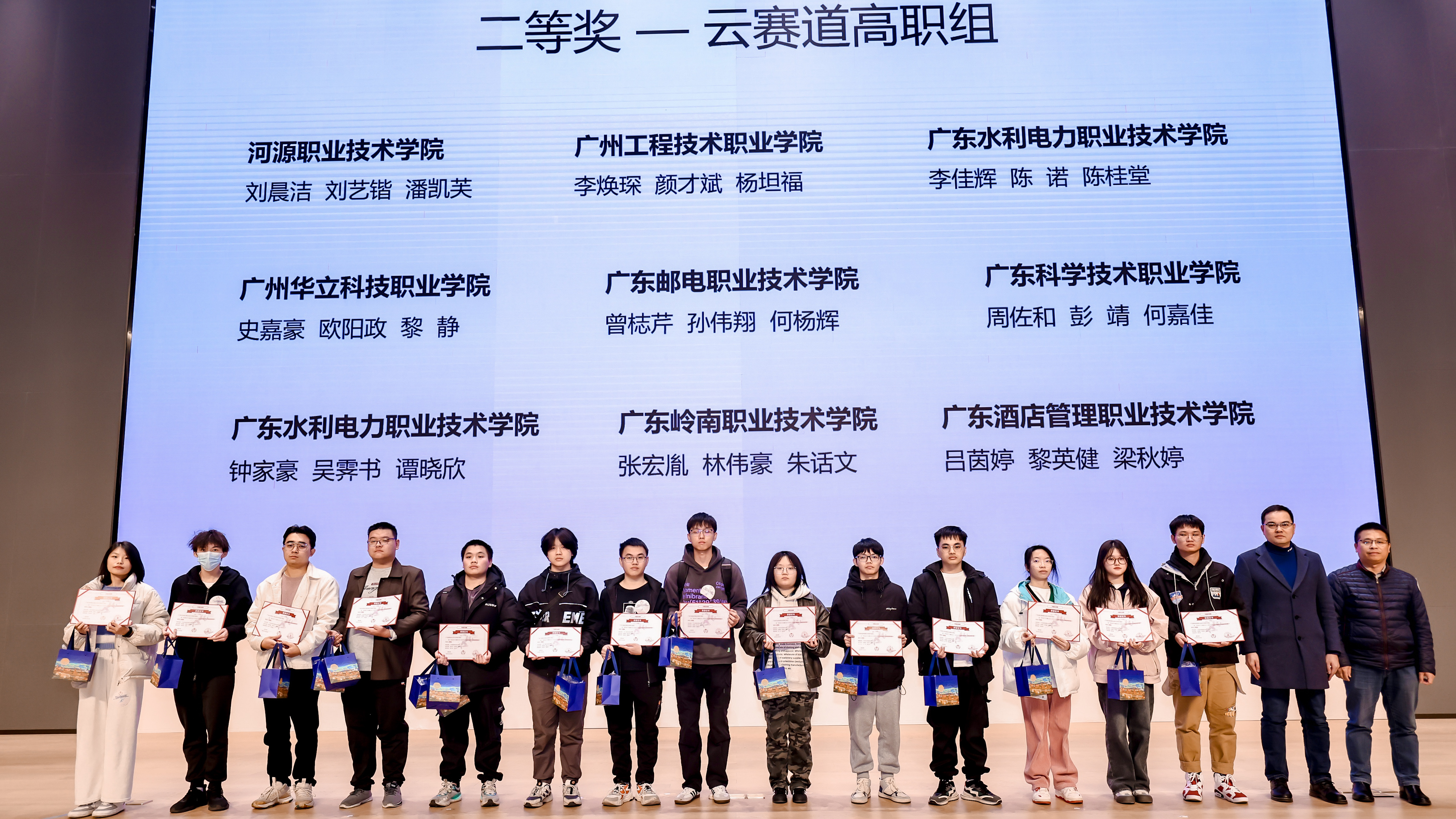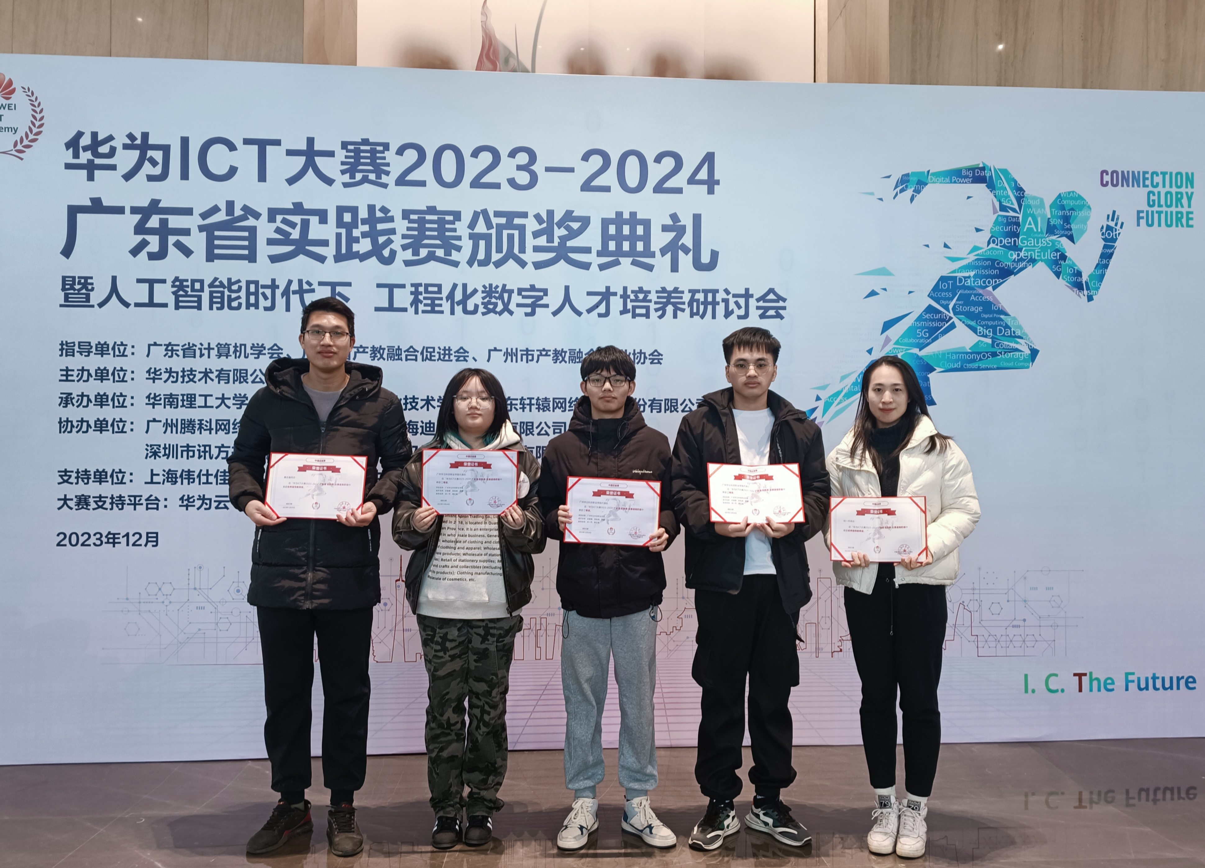在2023年10月至12月舉行的華為ICT大賽中,由我校計(jì)算機(jī)學(xué)院學(xué)生歐陽(yáng)政、史嘉豪(云浮校區(qū))、黎靜(廣州校區(qū))和指導(dǎo)老師鄧一平、黃志強(qiáng)組成的參賽小組獲得廣東省實(shí)踐賽決賽云賽道高職組二等獎(jiǎng)一項(xiàng),另有2個(gè)參賽小組分別獲得計(jì)算賽道和網(wǎng)絡(luò)賽道的三等獎(jiǎng)2項(xiàng)。部分獲獎(jiǎng)學(xué)生和指導(dǎo)老師出席了12月24日在廣州舉行的頒獎(jiǎng)典禮。