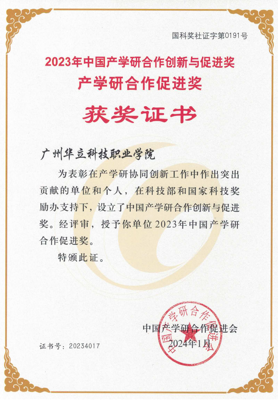 中國產(chǎn)學(xué)研合作創(chuàng)新與促進(jìn)獎(jiǎng)是經(jīng)科技部和國家科技獎(jiǎng)勵(lì)工作辦公室批準(zhǔn),由中國產(chǎn)學(xué)研合作促進(jìn)會設(shè)立的在產(chǎn)學(xué)研合作方面的全國性獎(jiǎng)項(xiàng), 也是中國產(chǎn)學(xué)研協(xié)同創(chuàng)新領(lǐng)域的最高榮譽(yù)獎(jiǎng),以表彰在推進(jìn)“政產(chǎn)學(xué)研金服用”深度融合中做出突出貢獻(xiàn)的先進(jìn)單位及個(gè)人。大會授予廣州華立科技職業(yè)學(xué)院“中國產(chǎn)學(xué)研合作促進(jìn)獎(jiǎng)”單位。