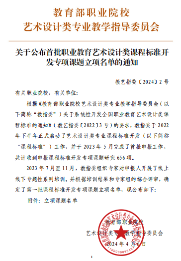 我校教師獲教育部職業(yè)院校藝術(shù)設(shè)計(jì)類專業(yè)教學(xué)指導(dǎo)委員會(huì)“首批課程標(biāo)準(zhǔn)開發(fā)專項(xiàng)課題”立項(xiàng)2項(xiàng)