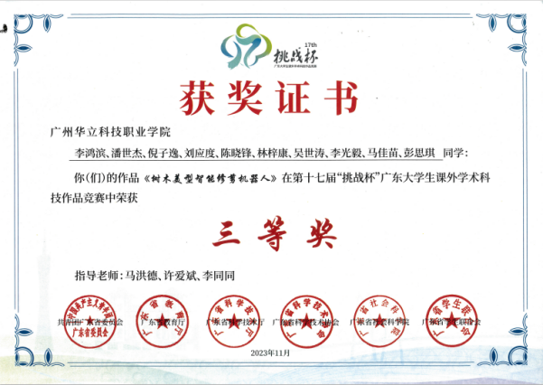 近期,在第十七屆“挑戰(zhàn)杯”廣東大學(xué)生課外學(xué)術(shù)科技作品競賽中,我校電力學(xué)院學(xué)生李鴻濱、潘世杰、倪子逸、劉應(yīng)度、陳曉鋒、林梓康、吳世濤、李光毅、馬佳苗、彭思琪的參賽作品《樹木美型智能修剪機器人》(指導(dǎo)教師馬洪德、許愛斌、李同同)榮獲省級三等獎。