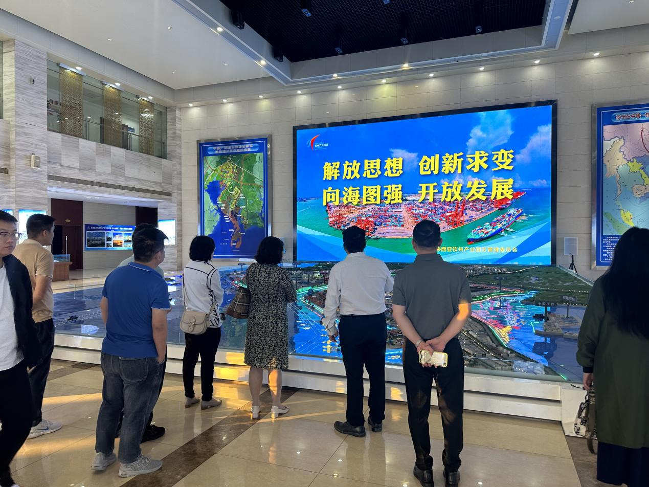 座談環(huán)節(jié)結(jié)束后,兩校赴中國(廣西)自由貿(mào)易試驗區(qū)欽州港片區(qū)參觀。在講解人員的帶領下,參觀了自貿(mào)區(qū)沙盤、觀看了自貿(mào)區(qū)介紹視頻,宏觀了解了自貿(mào)區(qū)的格局、運營等。
