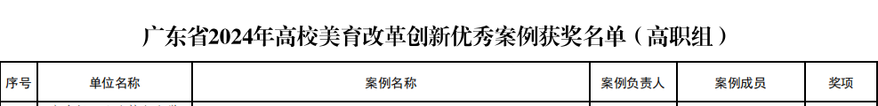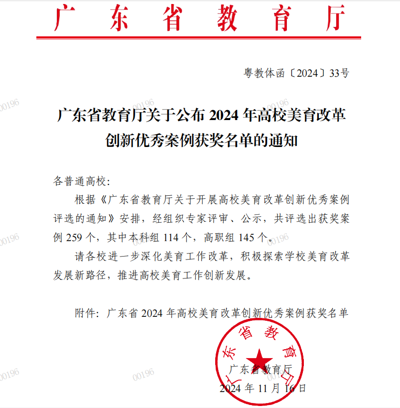 該項評選是廣東省教育廳為貫徹落實中共中央辦公廳、國務院辦公廳印發(fā)的《關(guān)于全面加強和改進新時代學校美育工作的意見》,深化全省高校美育工作綜合改革,推動高校美育工作創(chuàng)新發(fā)展,形成具有引領性、突破性、示范性的做法、舉措和經(jīng)驗,推進全省高校美育工作創(chuàng)新發(fā)展而開展的案例評選活動。經(jīng)省廳組織專家評審、公示,共評選出獲獎案例 259 個,其中本科組 114 個,高職組 145 個。此次案例獲獎也充分展示了我校在美育改革創(chuàng)新工作中的突出成效,后續(xù)學校將進一步深化美育工作改革,積極探索學校美育改革發(fā)展新路徑,推進我校美育工作創(chuàng)新發(fā)展。