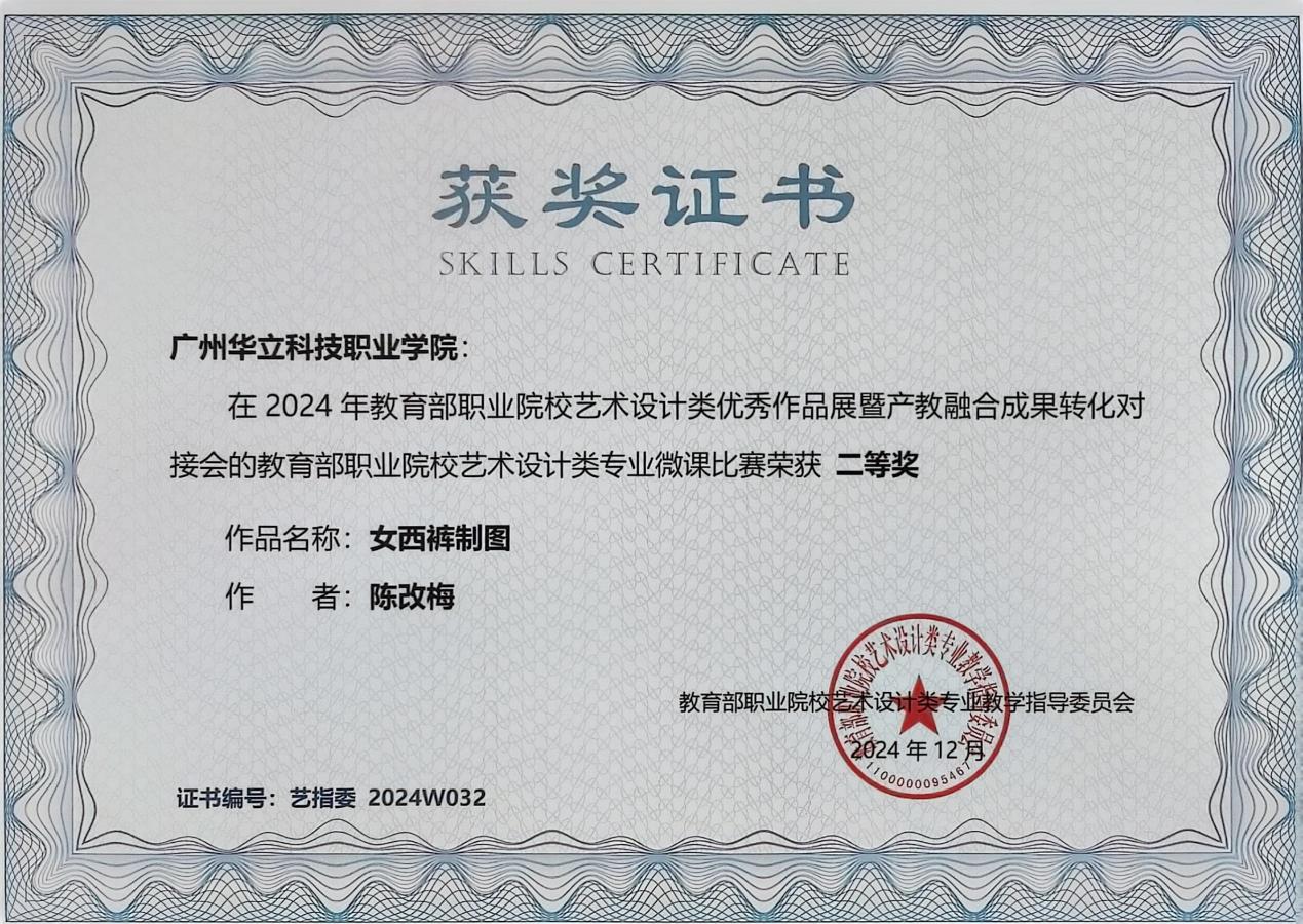 2024年12月13日-15日,由教育部職業(yè)院校藝術(shù)設(shè)計(jì)類專業(yè)教學(xué)指導(dǎo)委員會(huì)主辦的“職業(yè)院校藝術(shù)設(shè)計(jì)類優(yōu)秀作品展暨 2024年產(chǎn)教融合成果轉(zhuǎn)化對接會(huì)”在廣州琶洲靈感創(chuàng)新展館盛大舉行。在本次對接會(huì)的教育部職業(yè)院校藝術(shù)設(shè)計(jì)類專業(yè)微課比賽中,廣州華立科技職業(yè)學(xué)院藝術(shù)與傳媒學(xué)院陳改梅老師憑借作品《女西褲制圖》脫穎而出,榮獲國賽二等獎(jiǎng)。