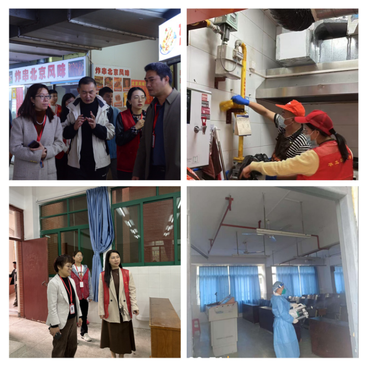 校領(lǐng)導(dǎo)帶領(lǐng)總務(wù)處工作人員檢查教室、食堂、燃?xì)獾惹闆r并進(jìn)行清潔和消殺