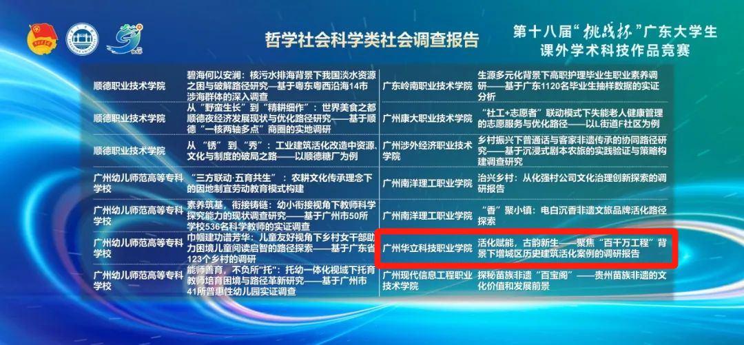 近日,我校藝術(shù)與傳媒學(xué)院劉嘉怡、陳改梅、宋依謎老師共同指導(dǎo)下,由王可欣、梁嘉雯、林燕津等學(xué)生共同完成的《活化賦能,古韻新生——聚焦“百千萬工程”背景下增城區(qū)歷史建筑活化案例的調(diào)研報告》在廣東省第十八屆“挑戰(zhàn)杯”大學(xué)生課外學(xué)術(shù)科技作品競賽決賽中斬獲二等獎,充分展現(xiàn)了我校青年學(xué)子以專業(yè)所學(xué)服務(wù)鄉(xiāng)村振興戰(zhàn)略的責(zé)任擔(dān)當(dāng)與創(chuàng)新實(shí)踐。