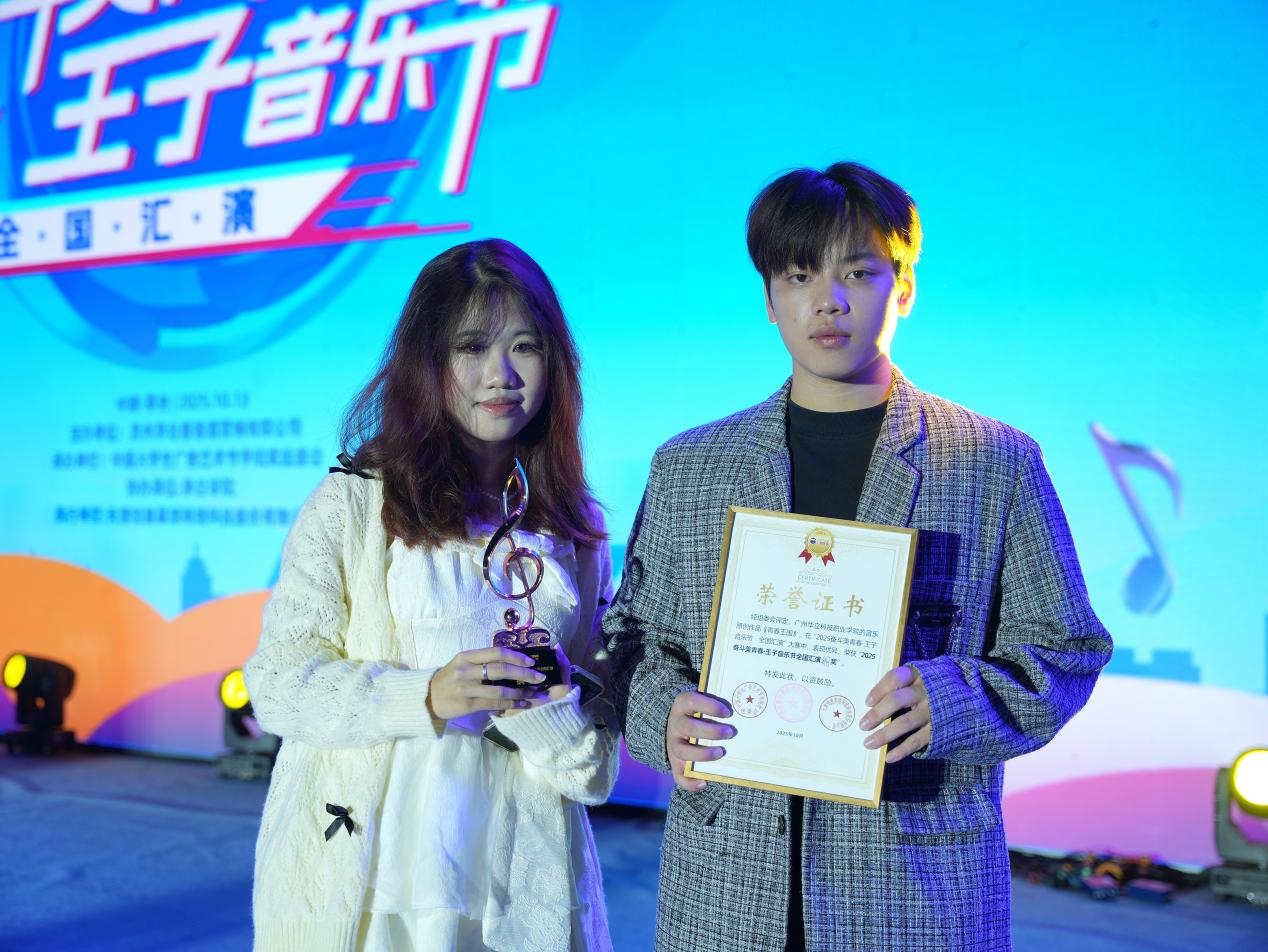 近日,由貴州茅臺(tái)集團(tuán)主辦、中國(guó)大學(xué)生廣告藝術(shù)節(jié)學(xué)院獎(jiǎng)組委會(huì)承辦的2025“奮斗美青春·王子音樂節(jié)”全國(guó)匯演在茅臺(tái)學(xué)院盛大舉行。廣州華立科技職業(yè)學(xué)院校長(zhǎng)廖俊杰、常務(wù)副校長(zhǎng)馬俊、藝術(shù)與傳媒學(xué)院院長(zhǎng)朱君受邀出席本次活動(dòng)。我校學(xué)生關(guān)梓峰、張鋇鋇的原創(chuàng)音樂作品《青春王國(guó)》榮獲2025“奮斗美青春·王子音樂節(jié)”原創(chuàng)音樂作品銅獎(jiǎng),同時(shí)學(xué)校還斬獲產(chǎn)教融合校企實(shí)踐銅獎(jiǎng),充分展現(xiàn)了我校在藝術(shù)教育與產(chǎn)教融合領(lǐng)域的實(shí)踐成果。