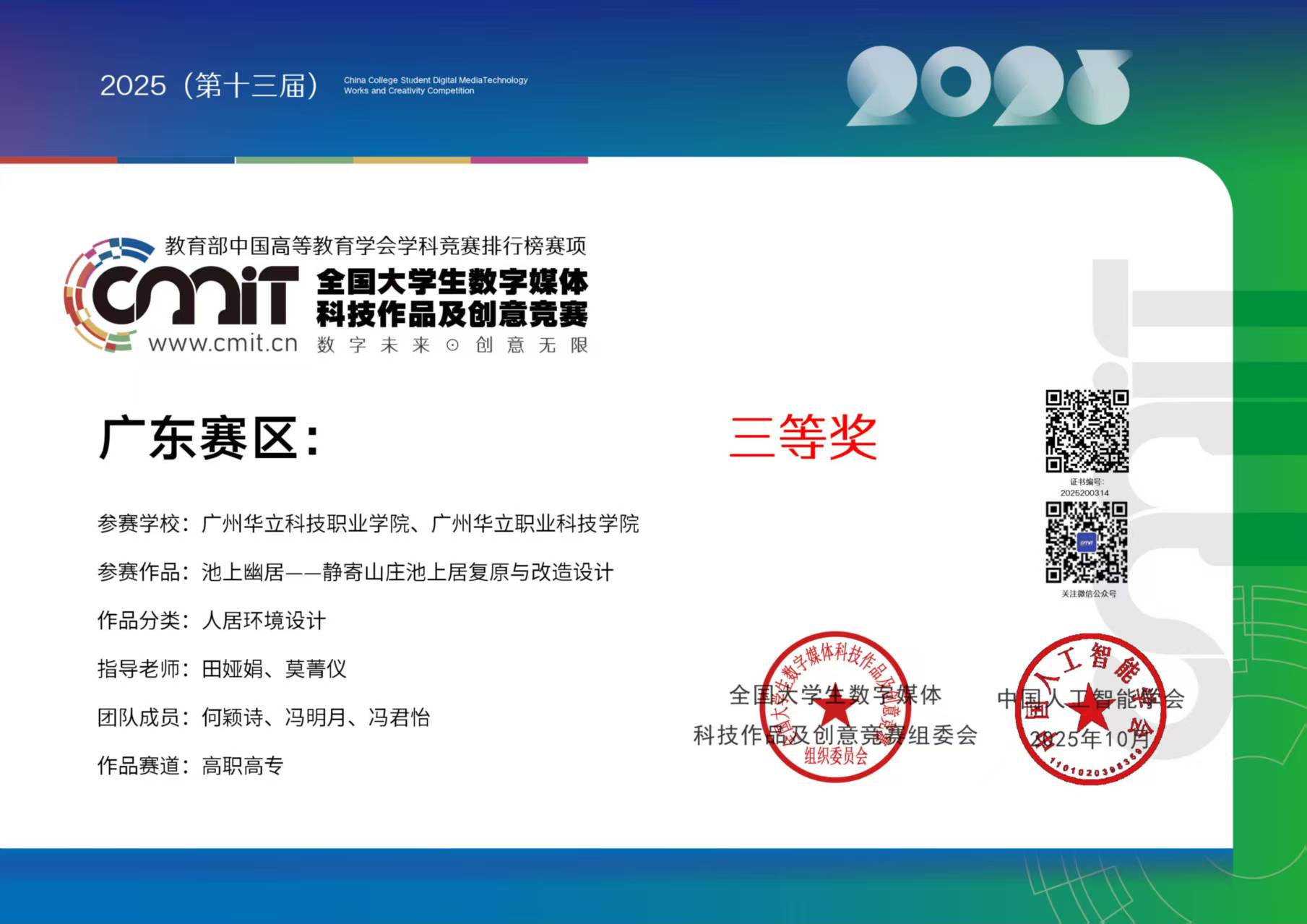 近日,備受全國(guó)高校關(guān)注的第 13 屆全國(guó)大學(xué)生數(shù)字媒體科技作品及創(chuàng)意競(jìng)賽圓滿落幕。城建學(xué)院師生憑借扎實(shí)的專業(yè)功底、創(chuàng)新的設(shè)計(jì)理念與出色的實(shí)踐能力,在全國(guó)眾多參賽隊(duì)伍中脫穎而出,最終斬獲全國(guó)總決賽三等獎(jiǎng)2項(xiàng),廣東省賽區(qū)二等獎(jiǎng)2項(xiàng)及三等獎(jiǎng)2項(xiàng)的優(yōu)異成績(jī),充分展現(xiàn)了學(xué)院在數(shù)字媒體教育領(lǐng)域的育人成果與學(xué)科實(shí)力。本次大賽是由全國(guó)大學(xué)生數(shù)字媒體科技作品及創(chuàng)意競(jìng)賽組委會(huì)主辦,旨在搭建高校數(shù)字媒體專業(yè)師生交流學(xué)習(xí)的平臺(tái),激發(fā)大學(xué)生的創(chuàng)新思維與科技創(chuàng)造力,推動(dòng)數(shù)字媒體技術(shù)與創(chuàng)意設(shè)計(jì)在各行業(yè)的融合應(yīng)用。大賽已連續(xù)舉辦13屆,是為藝術(shù)設(shè)計(jì)領(lǐng)域的高水平知名賽事,也是我院師生積極參與的重要專業(yè)競(jìng)賽之一。