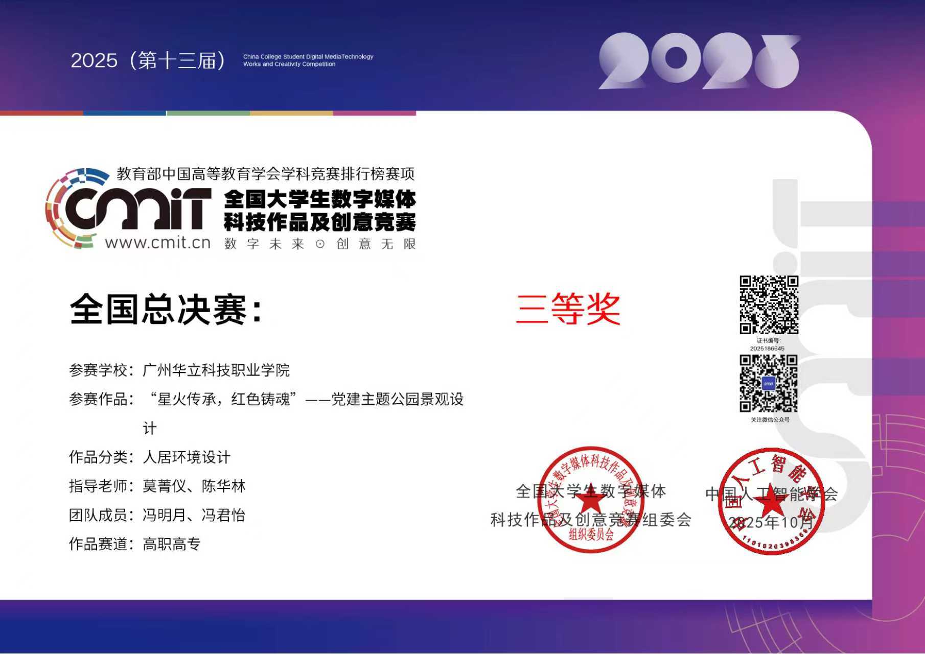 其中,由程若愚、莫菁儀、陳華林老師指導(dǎo),陳佳怡、馮明月等同學(xué)完成的作品《嶼光別院-鄉(xiāng)村民宿設(shè)計(jì)》、《星火傳承,紅色鑄魂”--黨建主題公園景觀設(shè)計(jì)》在全國(guó)大學(xué)生數(shù)字媒體科技作品及創(chuàng)意競(jìng)賽全國(guó)總決賽中榮獲三等獎(jiǎng)2項(xiàng),廣東賽區(qū)中獲二等獎(jiǎng)2項(xiàng);由田婭娟、莫菁儀、陳華林老師指導(dǎo),何穎詩、馮君怡等同學(xué)完成作品《池上幽居靜寄山莊池上居復(fù)原與改造設(shè)計(jì)》、《“廬州軌跡”--道路節(jié)點(diǎn)綠化景觀工程恢復(fù)設(shè)計(jì)》榮獲廣東賽區(qū)三等獎(jiǎng)2項(xiàng)。