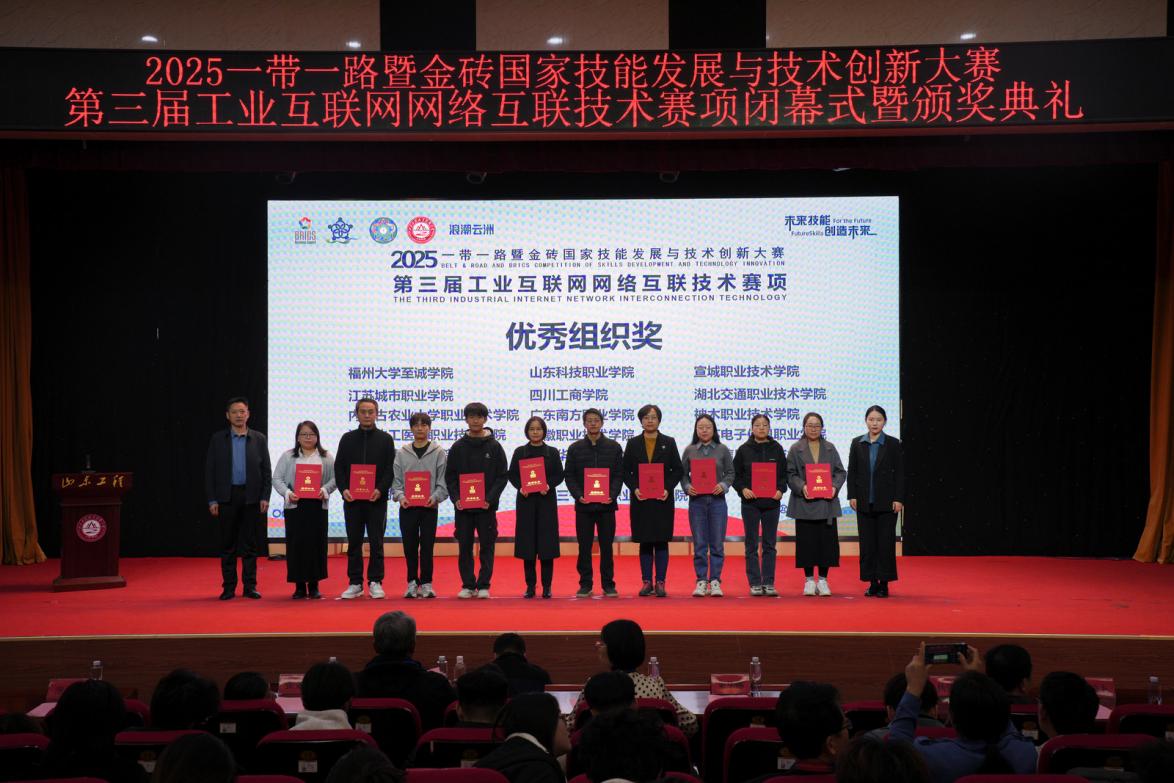2025年11月7日-9日,2025年“一帶一路”暨金磚國家技能發(fā)展與技術創(chuàng)新大賽第三屆工業(yè)互聯(lián)網網絡互聯(lián)技術賽項全國總決賽在山東工程職業(yè)技術大學隆重舉行,吸引了來自全國81所院校的132支參賽隊伍同場競技。我校計算機信息工程學院閔小翠、王建華老師指導選派的兩支代表隊(1隊:馮俊杰,劉俊浩、2隊:彭依琳,魏淙正),在全國總決賽賽場上,歷經四小時的激烈比拼,最終憑借扎實的專業(yè)知識、科學的團隊協(xié)作,最終脫穎而出,榮獲全國總決賽二等獎1項、三等獎1項,為學校贏得榮譽。我校榮獲“優(yōu)秀組織獎”、兩位指導教師榮獲“優(yōu)秀指導教師”稱號。