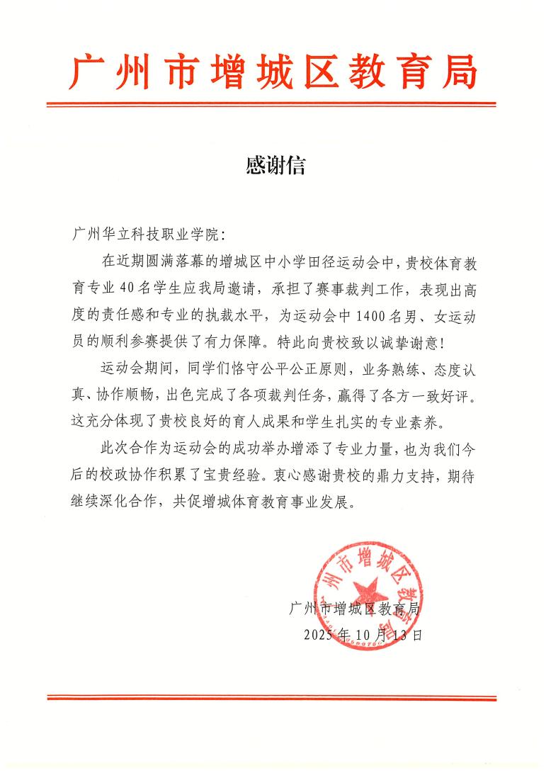 近日,我校藝術(shù)與傳媒學(xué)院收到來自增城區(qū)教育局的感謝信,對學(xué)院48名體育教育專業(yè)學(xué)生在“廣州市增城區(qū)中小學(xué)田徑運動會”中擔(dān)任裁判員所展現(xiàn)出的專業(yè)素養(yǎng)與敬業(yè)精神表示高度贊揚和誠摯感謝。此前,這批學(xué)子于2025年9月28日至30日受增城區(qū)教育局正式邀請,為運動會中1400名男、女運動員提供賽事執(zhí)裁服務(wù),同時他們以嚴(yán)謹(jǐn)?shù)膽B(tài)度、公正的判罰和出色的團(tuán)隊協(xié)作,贏得主辦方與參賽師生的一致好評。