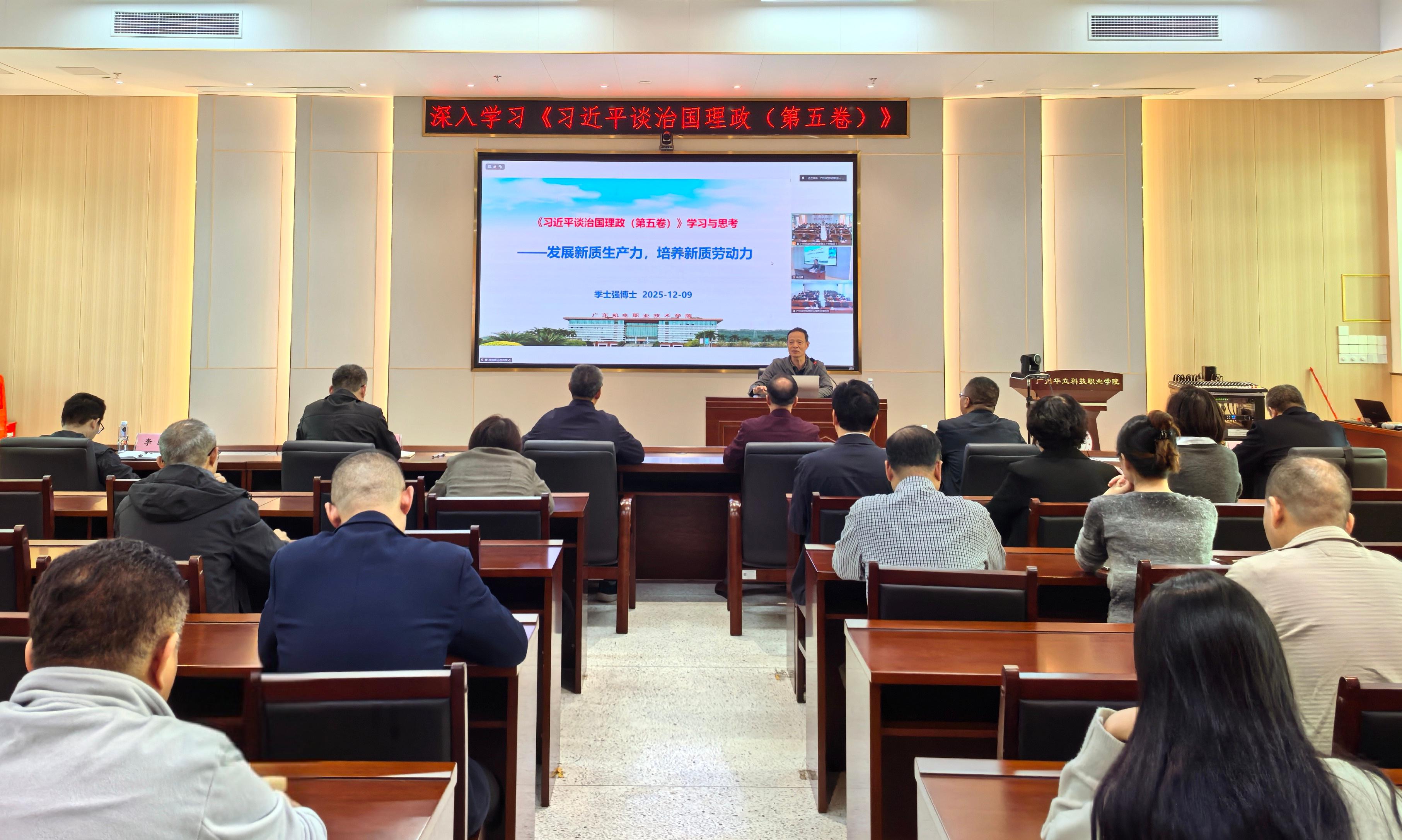 根據(jù)上級(jí)組織關(guān)于深入學(xué)習(xí)《習(xí)近平治國(guó)理政》(第五卷)的工作部署和我校落實(shí)省委教育工委關(guān)于開展公辦高校與民辦高校黨建和思想政治工作結(jié)對(duì)共建工作的具體安排,12月9日,我校在圖書館104會(huì)議室召開黨委理論學(xué)習(xí)中心組(擴(kuò)大)學(xué)習(xí)會(huì),特邀廣東機(jī)電職業(yè)技術(shù)學(xué)院季士強(qiáng)博士到校作專題輔導(dǎo)報(bào)告。學(xué)校黨政領(lǐng)導(dǎo)班子、各職能部門主要負(fù)責(zé)人、各二級(jí)學(xué)院黨組織書記及院長(zhǎng)等參加會(huì)議,云浮校區(qū)通過(guò)視頻連線參加。學(xué)習(xí)會(huì)由學(xué)校黨委辦公室主任梁德君主持。