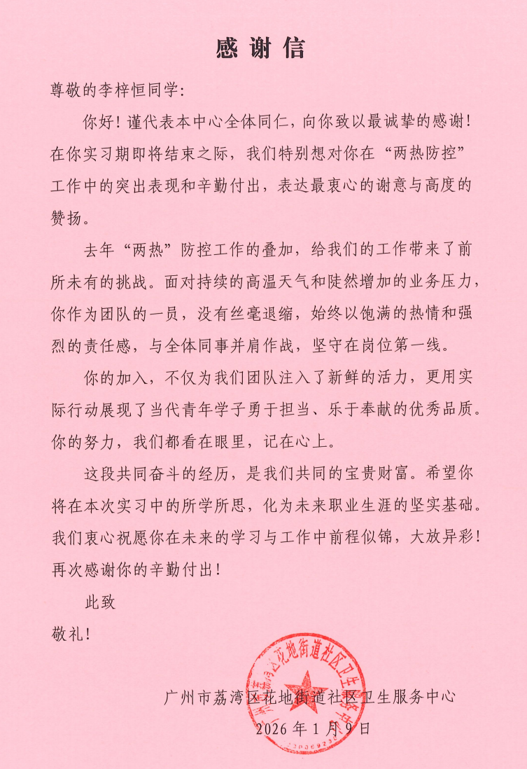 近日,廣州市荔灣區(qū)花地街道社區(qū)衛(wèi)生服務(wù)中心正式向我校中醫(yī)藥學(xué)院發(fā)來三封感謝信,對 2023 級實(shí)習(xí)生李淑冰(23 中醫(yī) 17 班)、凌桂華(23 中醫(yī) 17 班)、李梓恒(23 藥學(xué) 6 班)在基層實(shí)習(xí)期間的優(yōu)異表現(xiàn)給予高度評價(jià)與特別表揚(yáng),充分肯定了三位學(xué)子的職業(yè)素養(yǎng)與實(shí)踐能力。