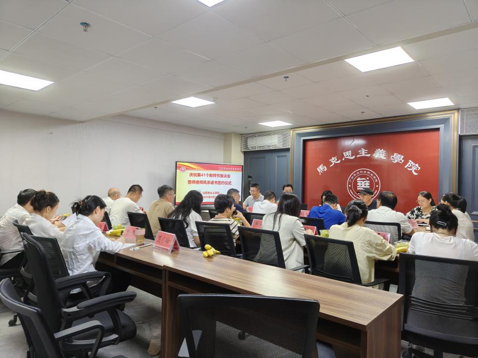 為學(xué)習(xí)弘揚(yáng)教育家精神,培育更優(yōu)良的師德師風(fēng),9月10日下午,馬克思主義學(xué)院在G1-314會議室舉行了慶祝第41個教師節(jié)座談會暨師德師風(fēng)承諾書簽訂儀式。