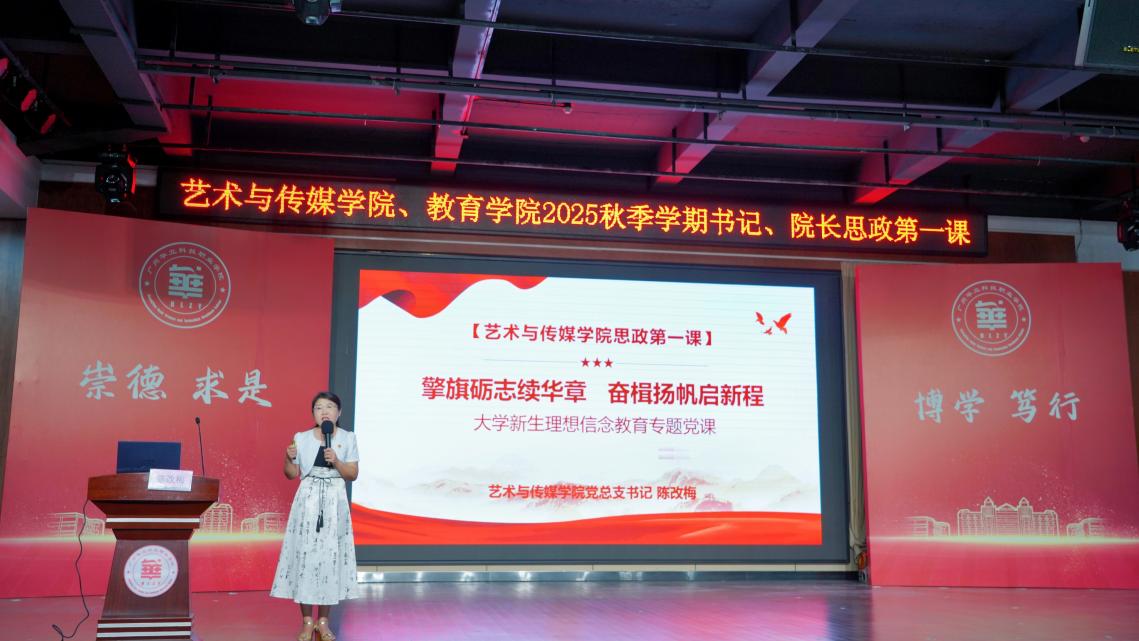 為引導(dǎo)和幫助青年學(xué)子學(xué)會用習(xí)近平新時代中國特色社會主義思想的先進(jìn)理論武裝頭腦,將個人成長與民族復(fù)興緊密相連,扣好人生“第一??圩印?,9月11日晚,藝術(shù)與傳媒學(xué)院黨總支書記陳改梅老師以 “擎旗礪志續(xù)華章 奮楫揚(yáng)帆啟新程”為主題,在圖書館八樓報告廳,為藝術(shù)與傳媒學(xué)院、教育學(xué)院新生帶來了情感觸動強(qiáng)烈、思想啟迪深刻的“思政第一課”。學(xué)院院長朱君、教師黨員和2025級新生參加聽課。