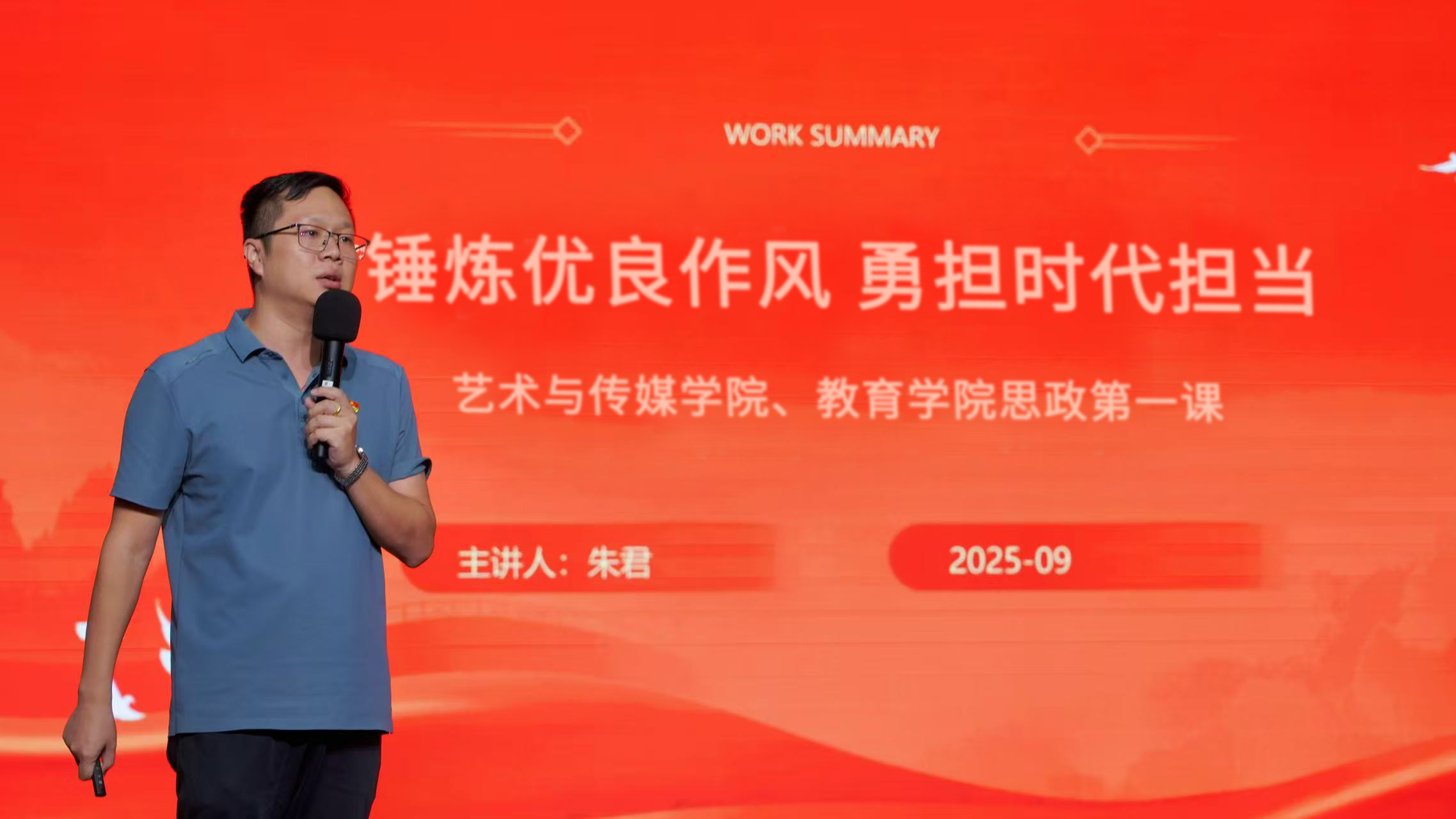 9 月 11 日,藝術(shù)與傳媒學(xué)院院長朱君以“錘煉優(yōu)良作風(fēng) 勇?lián)鷷r(shí)代擔(dān)當(dāng)”為主題,在圖書館八樓報(bào)告廳開講新學(xué)期“思政第一課”。藝術(shù)與傳媒學(xué)院、教育學(xué)院共計(jì)700余名師生代表齊聚現(xiàn)場聽課。
