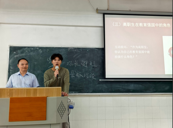 廖校長在最后總結時寄語,職業(yè)教育現代化是教育現代化的重要基石,高職青年應秉持精益求精的工匠精神和愛崗敬業(yè)的職業(yè)態(tài)度,在實現中國式現代化征程中貢獻“職教力量”。