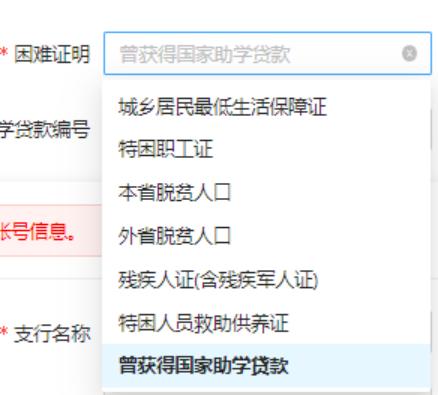 5.助學(xué)貸款合同編號(hào):選擇困難證明為曾獲得國(guó)家助學(xué)貸款時(shí)則顯示,選擇其它困難證明不顯示