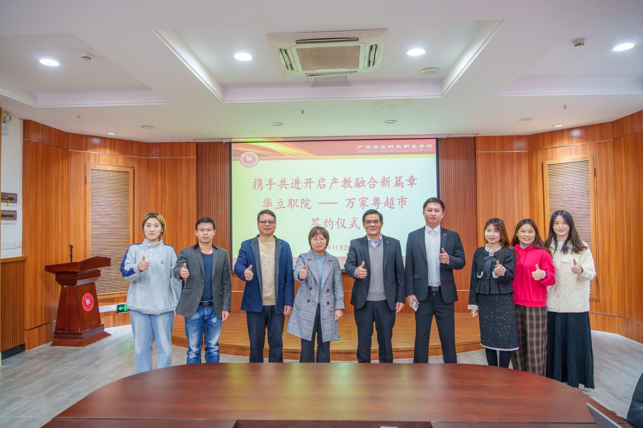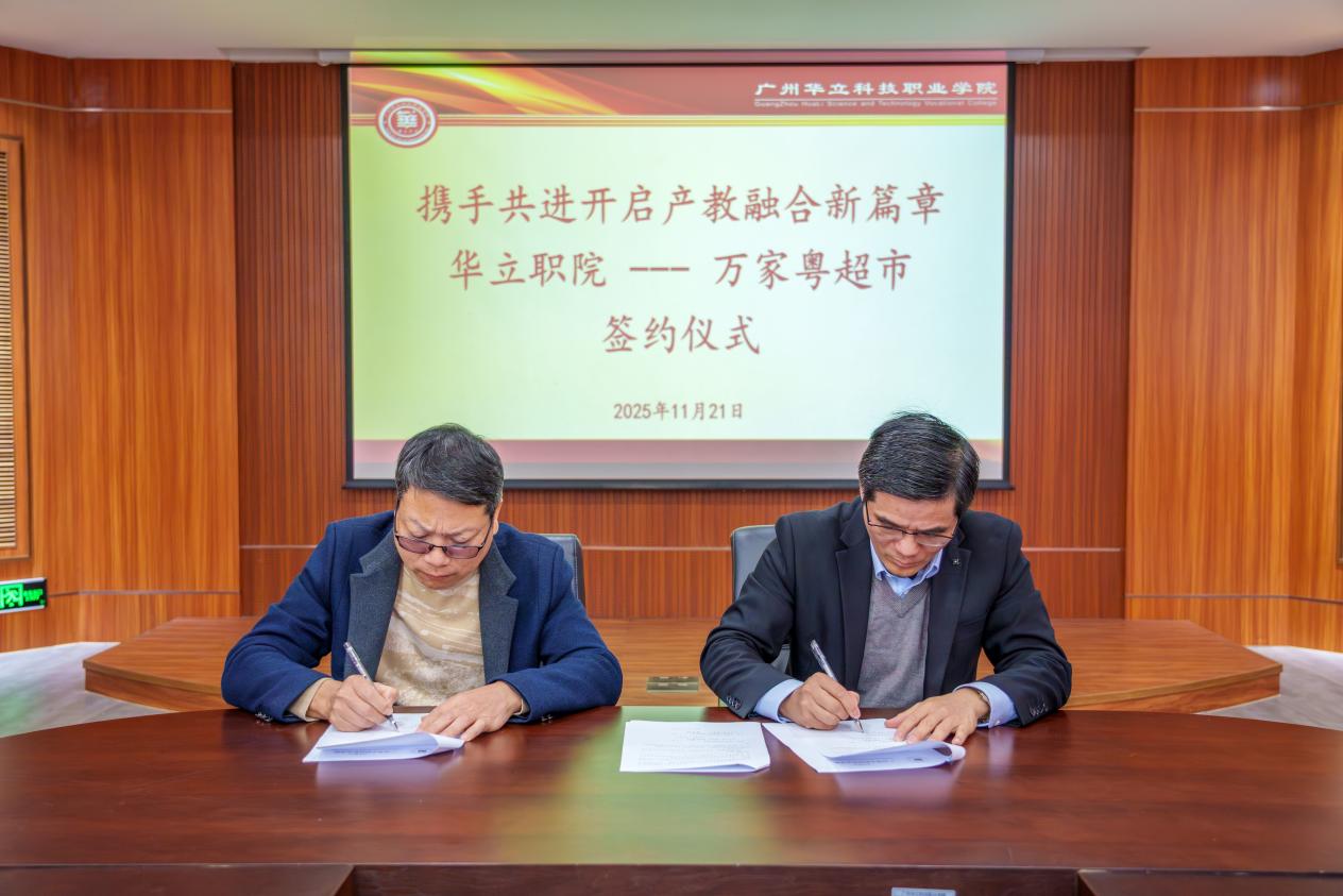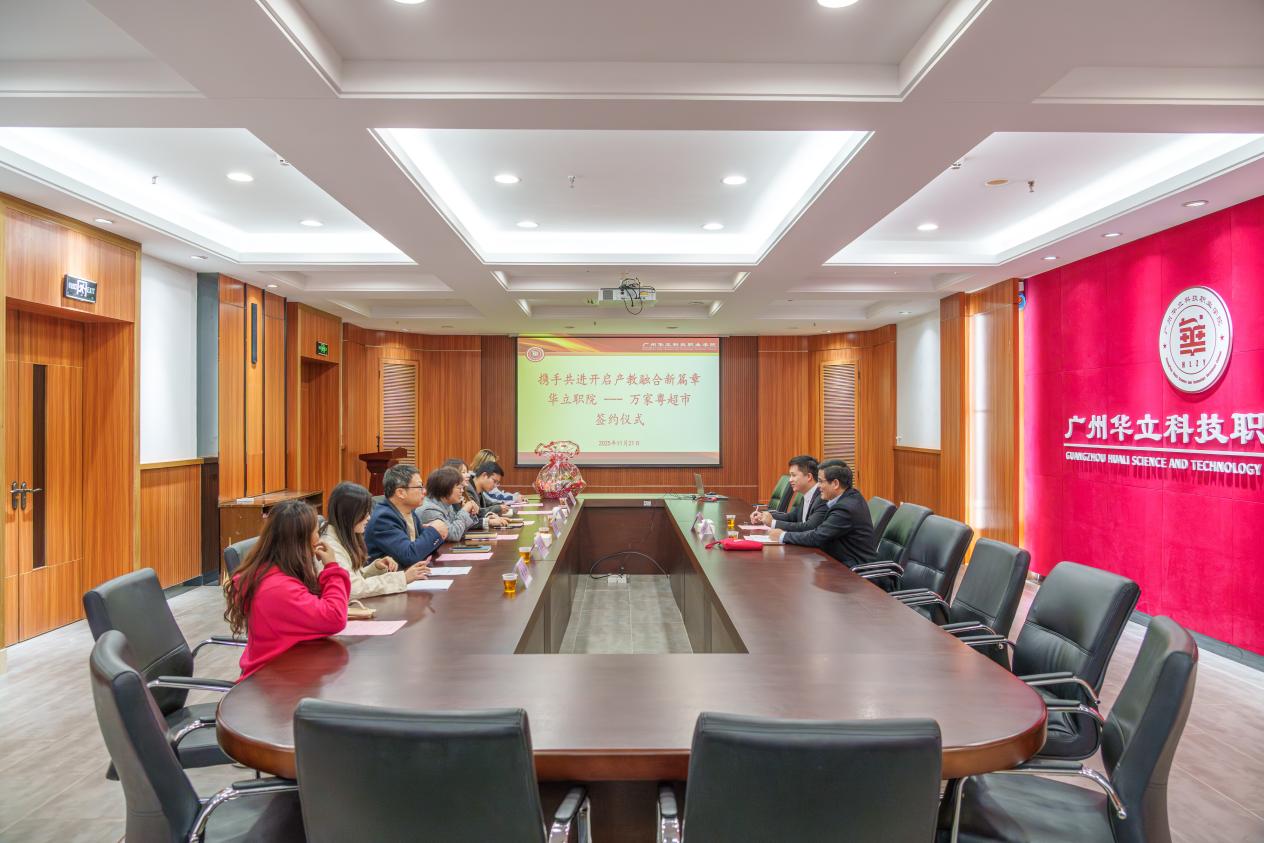 2025年11月20日,廣州華立科技職業(yè)學(xué)院與云浮市萬(wàn)家粵超市有限公司在云浮校區(qū)圖書館一樓會(huì)議室舉行以“攜手共進(jìn),開啟產(chǎn)教融合新篇章”為主題的校企合作簽約儀式。萬(wàn)家粵超市總經(jīng)理林坤爍、企劃部經(jīng)理林暑佳,廣州華立科技職業(yè)學(xué)院黨委副書記、副校長(zhǎng)王洪艷,經(jīng)管學(xué)院副院長(zhǎng)劉軍根、學(xué)校辦公室副主任林子云、黨委宣傳部副部長(zhǎng)劉廣等校企代表出席儀式。