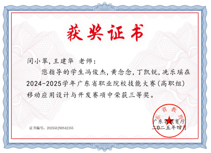 指導(dǎo)學(xué)生比賽獲獎(jiǎng)多項(xiàng),包括省職業(yè)技能大賽、挑戰(zhàn)杯、2025-帶一路暨金磚國(guó)家技能發(fā)展與技術(shù)創(chuàng)新大賽、廣東省大學(xué)生計(jì)算機(jī)設(shè)計(jì)大賽、中國(guó)機(jī)器人及人工智能大賽、華為ICT大賽、藍(lán)橋杯、大唐杯等。