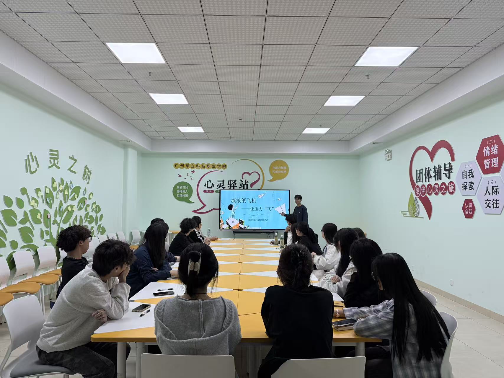 為幫助學(xué)生科學(xué)應(yīng)對學(xué)業(yè)、就業(yè)、人際關(guān)系等多方面壓力,搭建情緒宣泄與同伴互助的支持平臺,12 月 24 日晚19:00,廣州華立科技職業(yè)學(xué)院教育學(xué)院在云浮校區(qū)心理團體輔導(dǎo)活動室成功開展《流浪的紙飛機 —— 讓壓力飛》心理團體輔導(dǎo)活動,活動由教育學(xué)院欒瑞林老師主持,教育學(xué)院心理輔導(dǎo)站站長玉成婷老師進行理論指導(dǎo),助力同學(xué)們在輕松互動中解鎖減壓技巧,收獲情感支持。