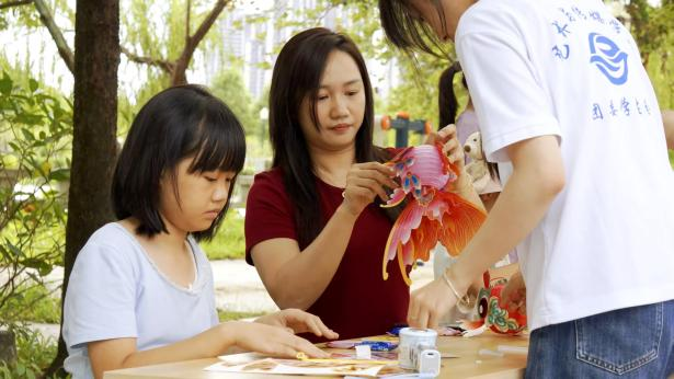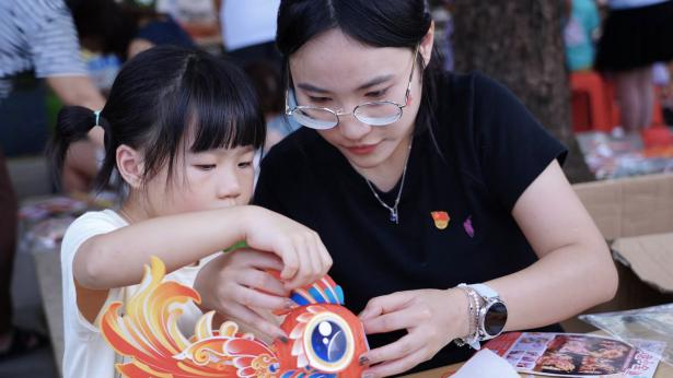村民們在非遺體驗區(qū)親手嘗試雙節(jié)彩扎魚燈,讓指尖觸碰傳統(tǒng)技藝的溫度;在互動游戲中猜燈謎,讓歡笑裝點團圓的時光。志愿者手把手教學的同時,穿插講解“非遺中的紅色故事”,將文化傳承與黨建教育巧妙結(jié)合。這些活動背后,是“政校企農(nóng)”協(xié)同創(chuàng)新理念的實踐,更是高校對“以文化人、以美育人”的踐行。