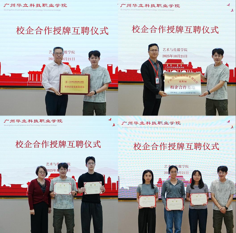 為深化產(chǎn)教融合,拓寬學(xué)生就業(yè)創(chuàng)業(yè)視野,2025年10月21日下午,廣州華立科技職業(yè)學(xué)院藝術(shù)與傳媒學(xué)院與廣州冠岳網(wǎng)絡(luò)科技有限公司在學(xué)校圖書館104隆重舉行了“數(shù)藝世界”校企合作簽約授牌互聘儀式暨就業(yè)創(chuàng)業(yè)經(jīng)驗(yàn)分享會(huì)。本次活動(dòng)得到了校企雙方的高度重視。學(xué)校副校長(zhǎng)陳顯強(qiáng)、教務(wù)處處長(zhǎng)孫麗英、實(shí)踐教學(xué)科科長(zhǎng)韋建林,藝術(shù)與傳媒學(xué)院院長(zhǎng)朱君、黨總支書記陳改梅等領(lǐng)導(dǎo)老師出席活動(dòng)。廣州冠岳網(wǎng)絡(luò)科技有限公司謝增福經(jīng)理、黃龍城項(xiàng)目總監(jiān)作為企業(yè)方代表參會(huì)。