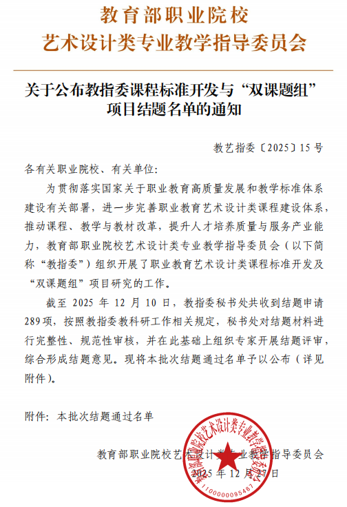 近日,教育部職業(yè)院校藝術(shù)設(shè)計(jì)類專業(yè)教學(xué)指導(dǎo)委員會正式公布課程標(biāo)準(zhǔn)開發(fā)與“雙課題組”項(xiàng)目結(jié)題名單。廣州華立科技職業(yè)學(xué)院藝術(shù)與傳媒學(xué)院申報的五項(xiàng)課題全部通過結(jié)題評審,展現(xiàn)了學(xué)校在職業(yè)教育藝術(shù)設(shè)計(jì)類專業(yè)建設(shè)中的扎實(shí)成果與創(chuàng)新活力。