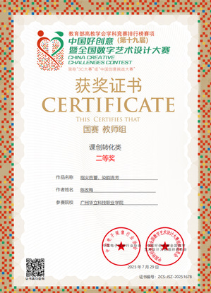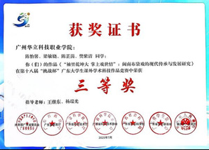 五、2025年7月,在廣東省第十八屆“挑戰(zhàn)杯”大學(xué)生課外學(xué)術(shù)科技作品競賽決賽中,藝傳師生斬獲“挑戰(zhàn)杯”省賽“二等獎”1項(xiàng),“三等獎”1項(xiàng),充分展現(xiàn)了藝傳學(xué)院青年學(xué)子以專業(yè)所學(xué)服務(wù)鄉(xiāng)村振興戰(zhàn)略的責(zé)任擔(dān)當(dāng)與創(chuàng)新實(shí)踐,更展現(xiàn)了學(xué)校以產(chǎn)教融合助力“百千萬工程”的積極實(shí)踐,助力嶺南文化名片在新時(shí)代綻放光彩。