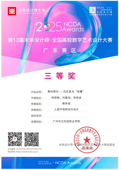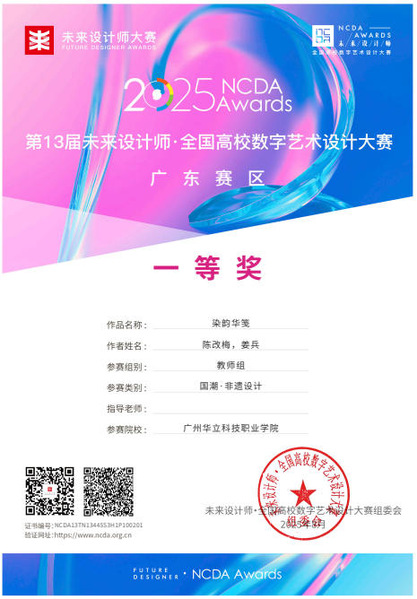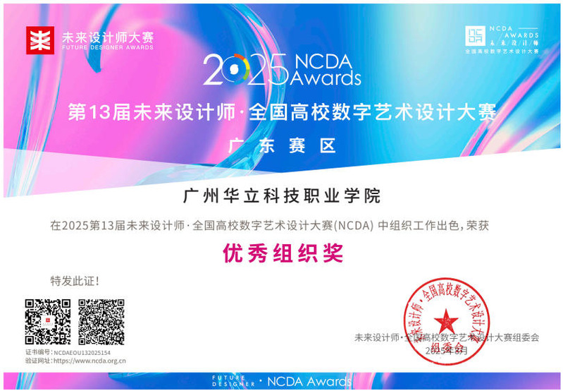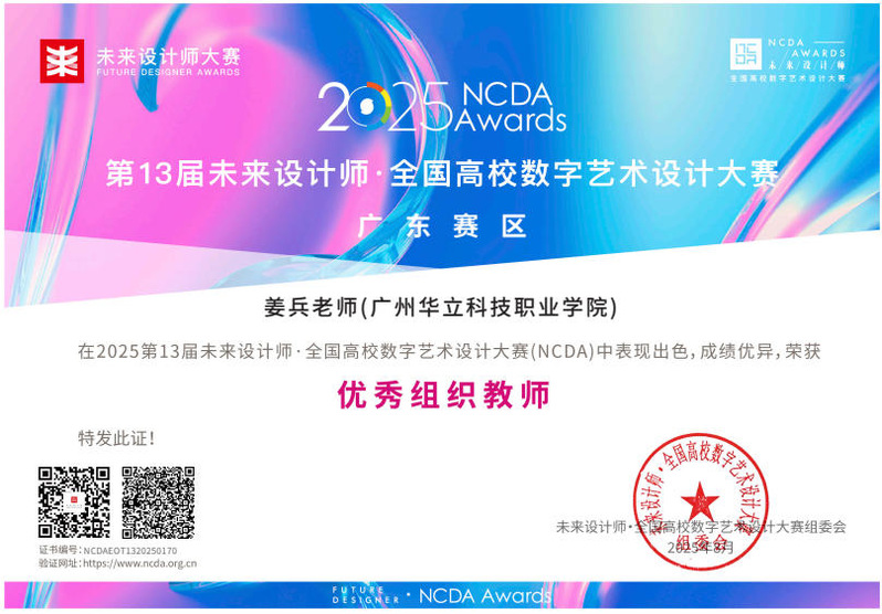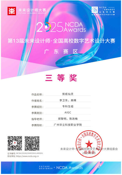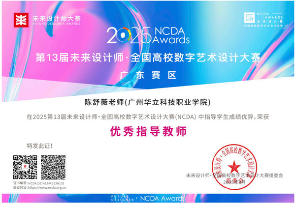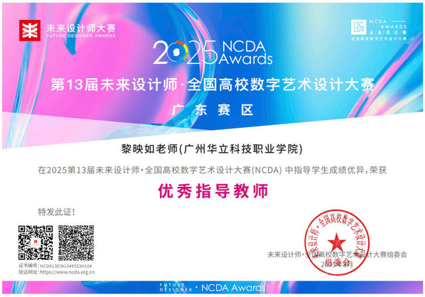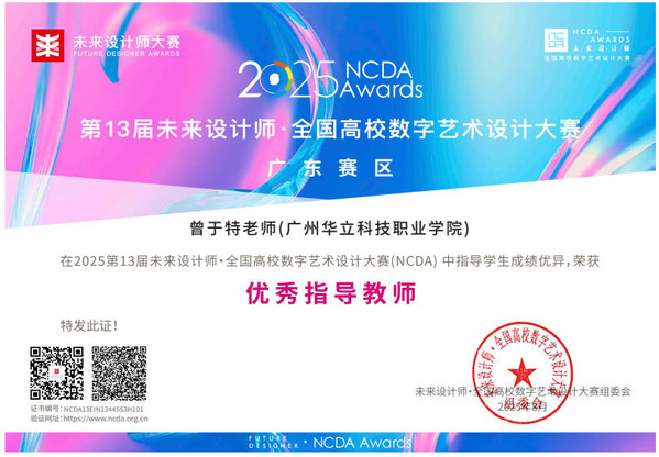 九、2025年8月,未來設(shè)計(jì)師·全國高校數(shù)字藝術(shù)設(shè)計(jì)大賽(NCDA)是入選《全國普通高校大學(xué)生競賽排行榜》,近20家省教育廳認(rèn)定,“學(xué)習(xí)強(qiáng)國”學(xué)習(xí)平臺支持,對接聯(lián)合國國際賽的全國性大學(xué)生競賽。是高校教育教學(xué)改革和創(chuàng)新人才培養(yǎng)的重要競賽項(xiàng)目之一,具有極高的知名度與影響力。在第13屆未來設(shè)計(jì)師·全國高校數(shù)字藝術(shù)設(shè)計(jì)大賽(NCDA)中,藝術(shù)與傳媒學(xué)院師生在廣東省賽區(qū)共獲獎12項(xiàng)。其中,我校獲得優(yōu)秀組織單位獎1項(xiàng);學(xué)生組“一等獎”2項(xiàng),“三等獎”2項(xiàng);教師組“一等獎”1項(xiàng),“三等獎”1項(xiàng);“優(yōu)秀指導(dǎo)教師獎”4項(xiàng);“優(yōu)秀組織教師獎”1項(xiàng)。