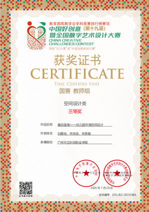 二、2025年4月,由廣東省教育廳主辦、廣州番禺職業(yè)技術(shù)學(xué)院承辦的2024—2025學(xué)年廣東省職業(yè)院校技能大賽環(huán)境藝術(shù)設(shè)計(jì)賽項(xiàng),藝傳學(xué)子謝梁英、鐘曉婷、謝志煒、黎永豪在馬英超、謝瑞祥老師指導(dǎo)下,最終在全省65支參賽隊(duì)伍、200多名選手中脫穎而出,榮獲“三等獎”。