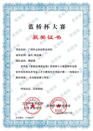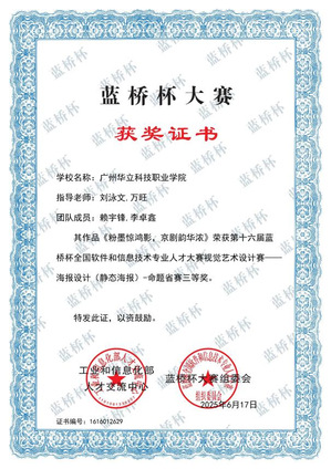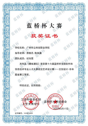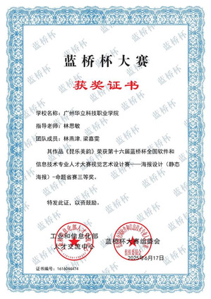 四、2025年6月,“藍(lán)橋杯全國軟件和信息技術(shù)專業(yè)人才大賽”由工業(yè)和信息化部人才交流中心主辦,連續(xù)多年入選中國高等教育學(xué)會“全國普通高校學(xué)科競賽排行榜”。本屆大賽省賽在全國31個(gè)省市自治區(qū)舉辦,來自北京大學(xué)、清華大學(xué)、復(fù)旦大學(xué)、上海交通大學(xué)等1900多所高校的23萬名選手同臺競技。在第十六屆“藍(lán)橋杯?視覺藝術(shù)設(shè)計(jì)大賽”藝術(shù)與傳媒學(xué)院學(xué)子斬獲“一等獎”2項(xiàng)、“二等獎”1項(xiàng)、“三等獎”5項(xiàng)。
