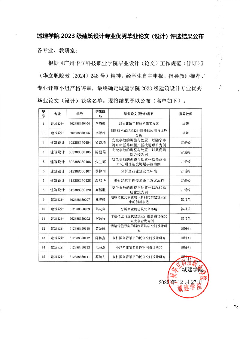 城建學(xué)院2023級(jí)建筑設(shè)計(jì)專業(yè)優(yōu)秀畢業(yè)論文(設(shè)計(jì))評(píng)選公布