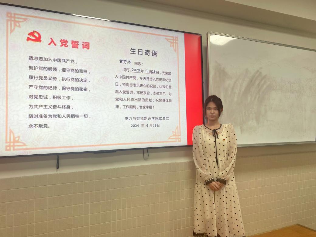 作為電力與智能制造學院云浮校區(qū)的一名教師黨員甘芳婷,2024年6月19日早上,收到了學院黨組織發(fā)的“政治生日”賀卡,我的心情特別興奮,也感謝組織的關懷。6月19日,是我的政治生日,火紅的黨旗永遠飄揚在我心中,莊嚴的入黨誓詞永遠融入我靈魂深處,它已轉化成我行動的力量,使我以堅強的黨員意志投入到黨的工作中,甘于拼搏奉獻。