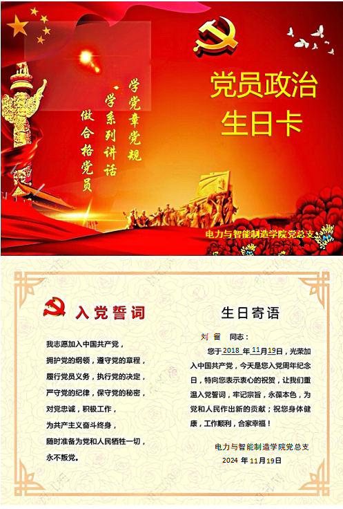 作為電力與智能制造學院的一名黨員教師劉留,在收到學院黨組織發(fā)來的“政治生日”賀卡,我的心情特別興奮,也感謝組織的關懷。11月19日,是我的政治生日,我認為政治生日是表達對黨的忠誠和堅定的重要時刻。在這個特殊的日子里,我回顧自己的入黨歷程,思考自己的初心和使命,這是一種對黨的忠誠和信仰的再次強化。