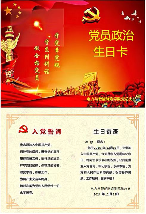 作為電力與智能制造學(xué)院的一名黨員教師鐘穎,在收到學(xué)院黨組織發(fā)來的“政治生日”賀卡,我的心情特別興奮,也感謝組織的關(guān)懷。12月19日,是我的政治生日,我認(rèn)為政治生日是表達對黨的忠誠和堅定的重要時刻。