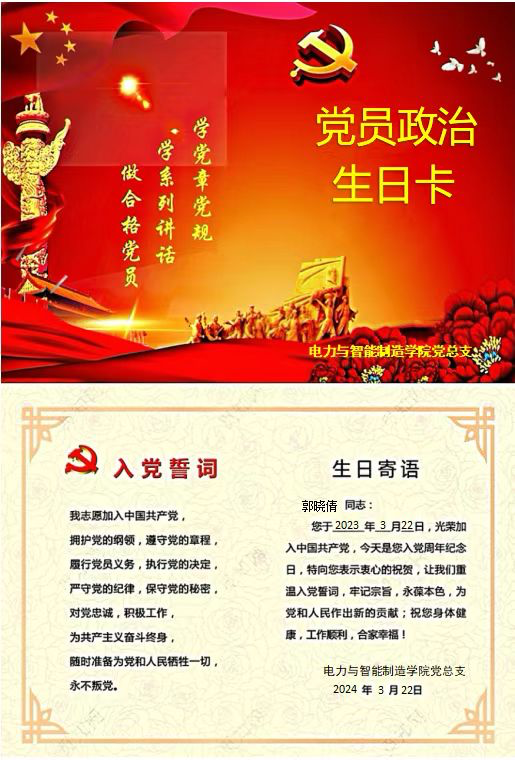 作為電力與智能制造學院教師黨員郭曉倩,3月22日早上,收到了學院黨組織發(fā)的“政治生日”賀卡,心情特別興奮,2023年3月22日是我光榮加入中國共產黨的日子。
