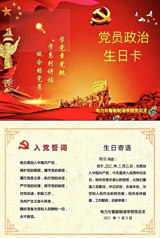作為電力與智能制造學(xué)院云浮校區(qū)的一名教師黨員熊浩,2025年5月31日收到學(xué)院黨組織發(fā)的“政治生日”賀卡,我滿心歡喜,更懷著對組織深切關(guān)懷的感恩之情,迎來政治生日這一極具紀(jì)念意義的時刻——5月31日。于我而言,政治生日承載著對黨無限忠誠與堅(jiān)定信念的莊重宣示?;厥淄?,入黨時那火紅黨旗的鮮艷色彩,早已深深烙印在我內(nèi)心深處,成為永不褪色的精神底色;而那莊嚴(yán)的入黨誓詞,每一個字、每一句話,都已融入我的靈魂,化作前行的不竭動力。這力量,賦予鋼鐵般的黨性意志,讓我在黨的事業(yè)征程中,無畏艱難險(xiǎn)阻,勇往直前。我愿將拼搏與奉獻(xiàn)當(dāng)作最質(zhì)樸的行動語言,在黨的工作中傾盡心力,不求回報(bào),只盼為黨和人民的事業(yè)添磚加瓦,用一生踐行入黨時的錚錚誓言,不負(fù)組織的培養(yǎng)與期望。