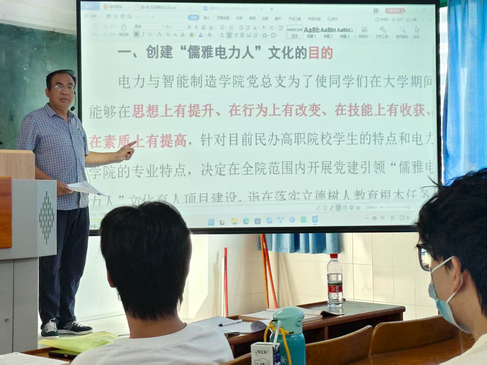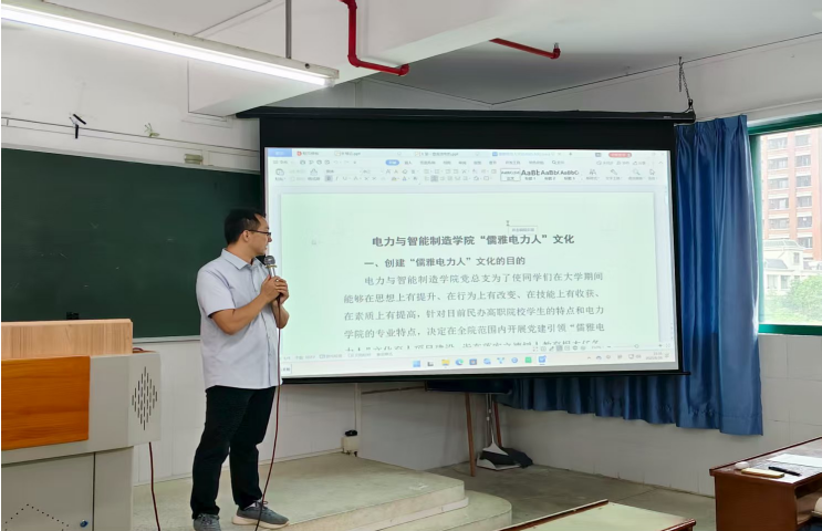 在“儒雅電力人”文化講解環(huán)節(jié),教師們結合學院發(fā)展歷程與各個專業(yè)行業(yè)特色,從“儒雅”的精神內涵、行為準則展開闡述。引導學生理解“儒雅”不僅是外在言行的得體,更是內在專業(yè)素養(yǎng)、責任擔當?shù)捏w現(xiàn)。在實驗室中嚴謹操作、在學習中謙遜求知、在未來工作中恪守行業(yè)規(guī)范,皆是“儒雅電力人”的生動實踐。針對大一新生,教師重點講解文化認知與角色轉變,幫助其建立學院歸屬感;對于大二,則結合專業(yè)學習進度,強調將文化理念融入專業(yè)實踐。各位老師還為學生們講解了“三寶學風”建設內涵。“書、筆、本|”三件寶貝,作為學風建設的核心載體,需要學生每節(jié)課都攜帶,方便記錄教師補充內容和做作業(yè),這些都屬于學習態(tài)度的考核內容。